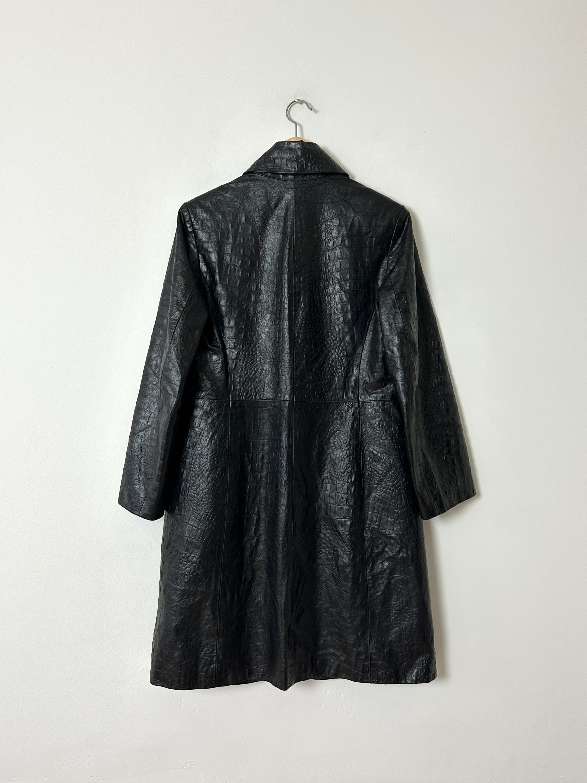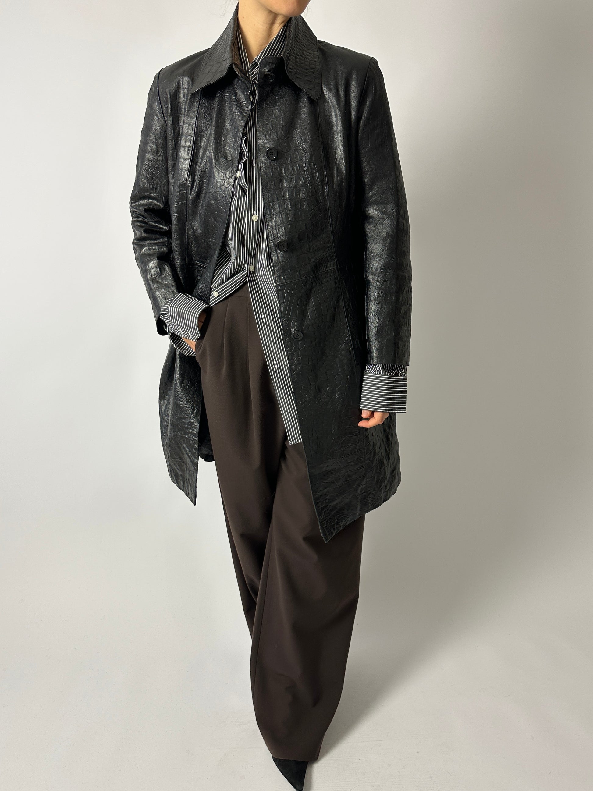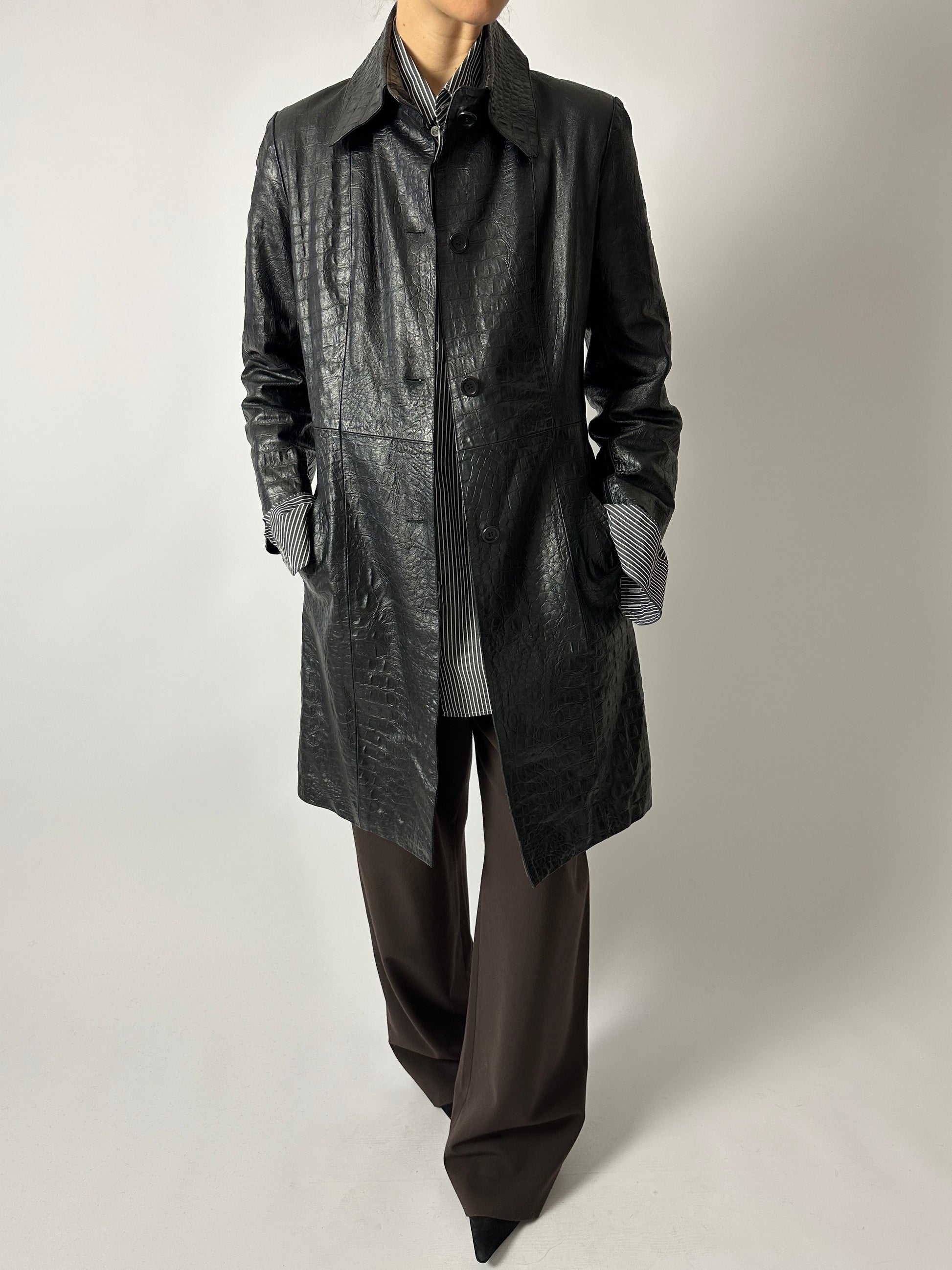This long coat, crafted from crocodile-embossed leather, offers a sleek, slim silhouette with a graceful drape. Fully lined, it is detailed with side pockets and a button-front closure for classic functionality.
