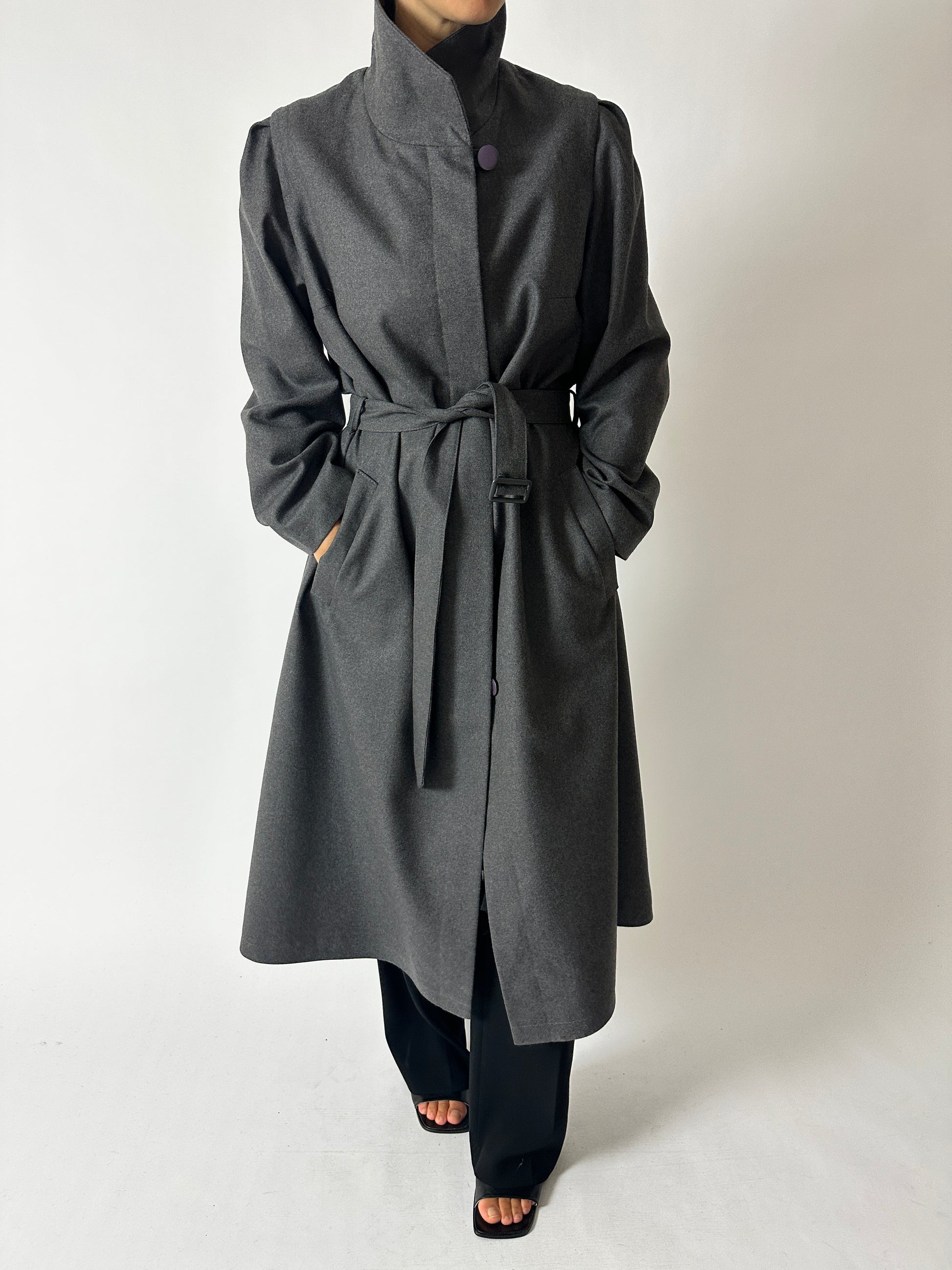 Long wool coat featuring a belted waist and large collar. Fully lined, offering a relaxed silhouette and timeless appeal.