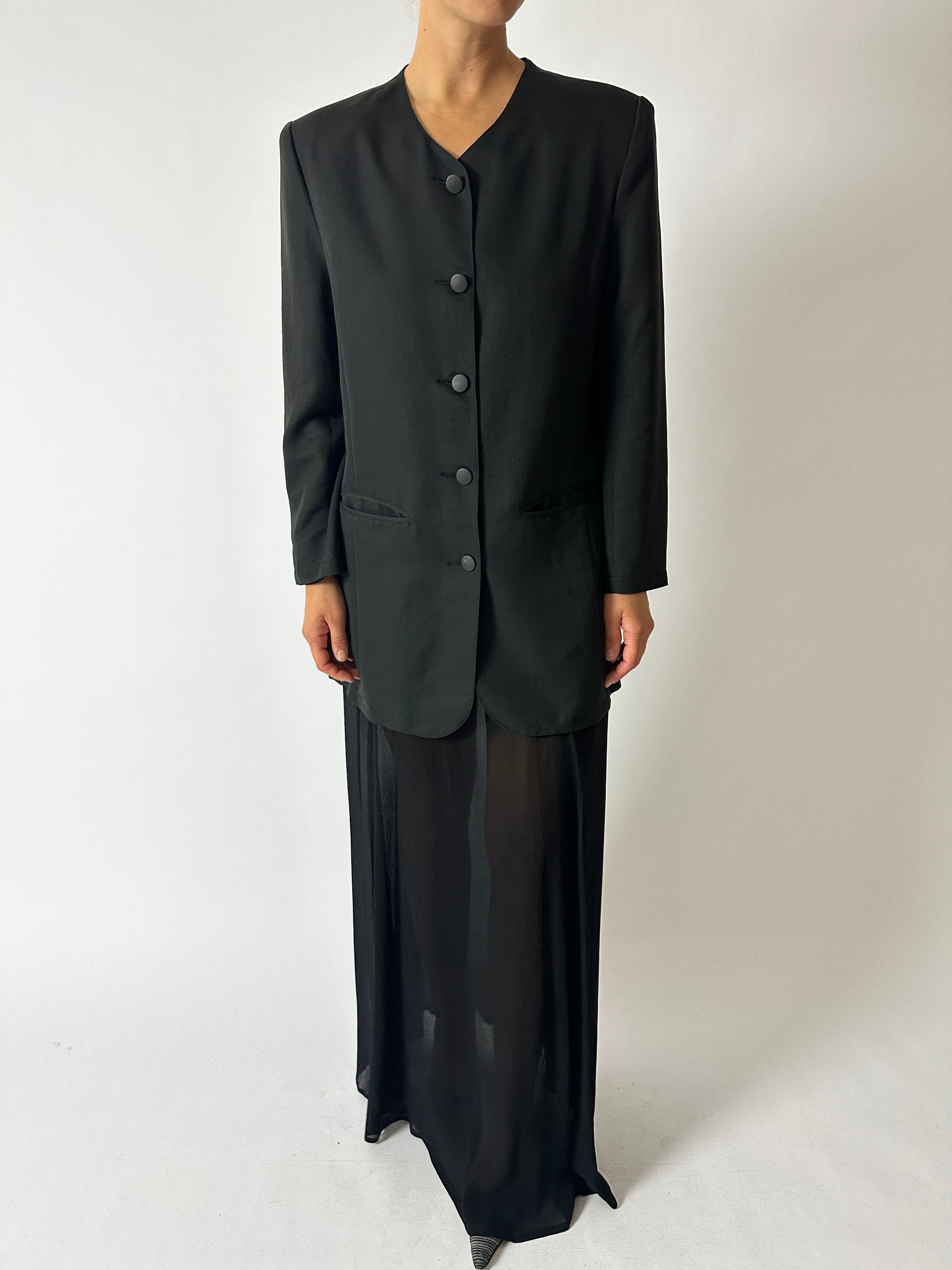 A collarless blazer in off-black, made from soft, lightweight fabric. Fully lined for comfort, it transitions effortlessly from casual looks to more dressed-up occasions.