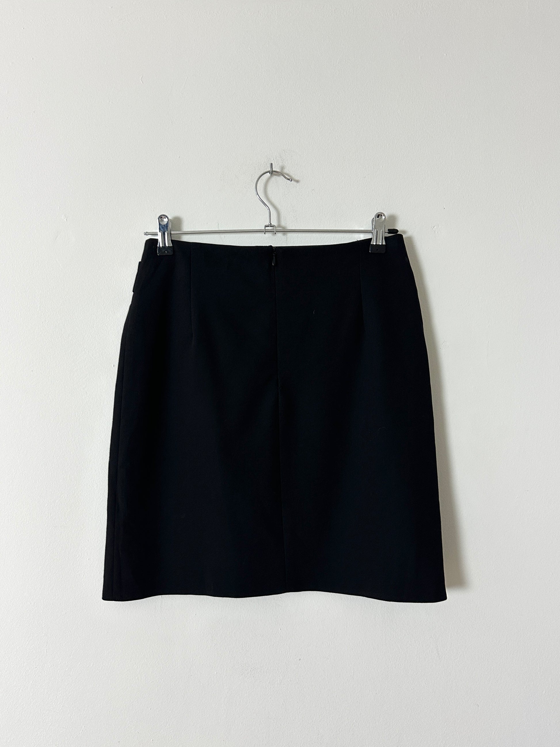 A black skirt with a mid-waist fit and a clean, regular silhouette. Features silver tone ring detail at the front, back zip closure, and full lining for comfort. A refined piece with subtle character and timeless appeal.