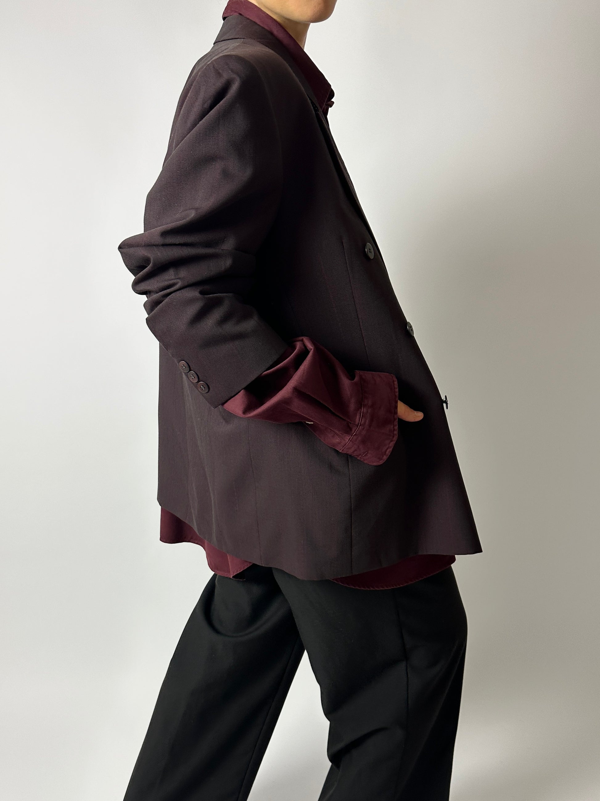 Made from a wool blend, this double-breasted blazer features structured shoulders, sharp lapels, and a timeless silhouette that easily transitions from office to evening.
