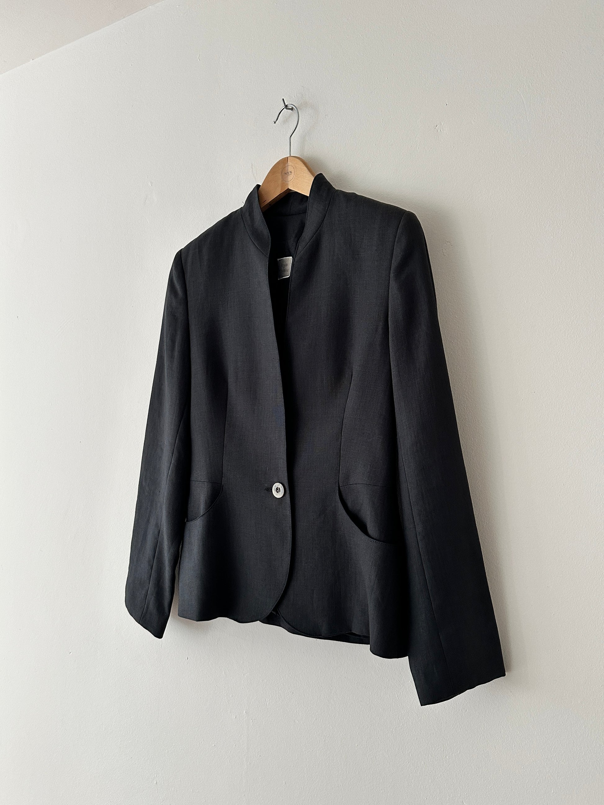 A tailored blazer in refined linen, featuring a sharp, fitted silhouette that embodies timeless elegance.