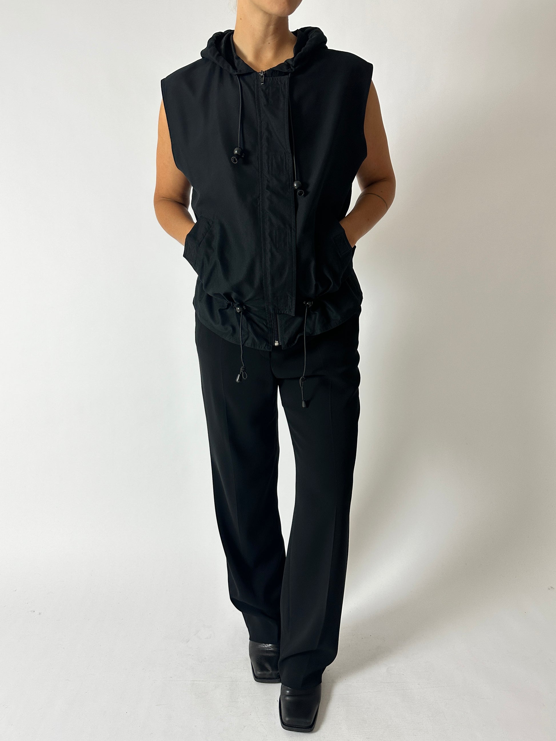 Hooded vest featuring a zip front, adjustable drawstring at the waist, and side pockets. Ideal for layering or styling solo for a casual, effortless look.