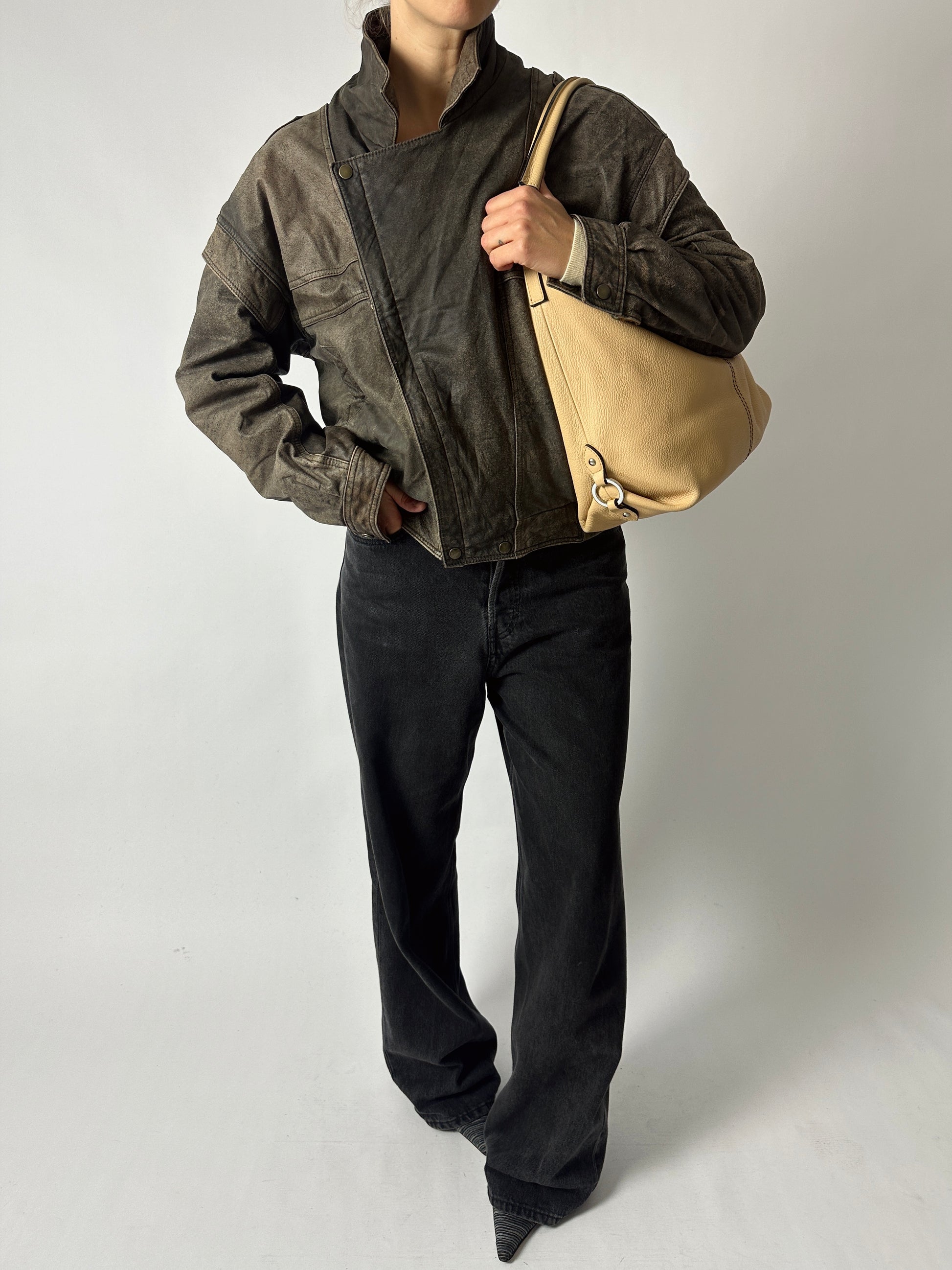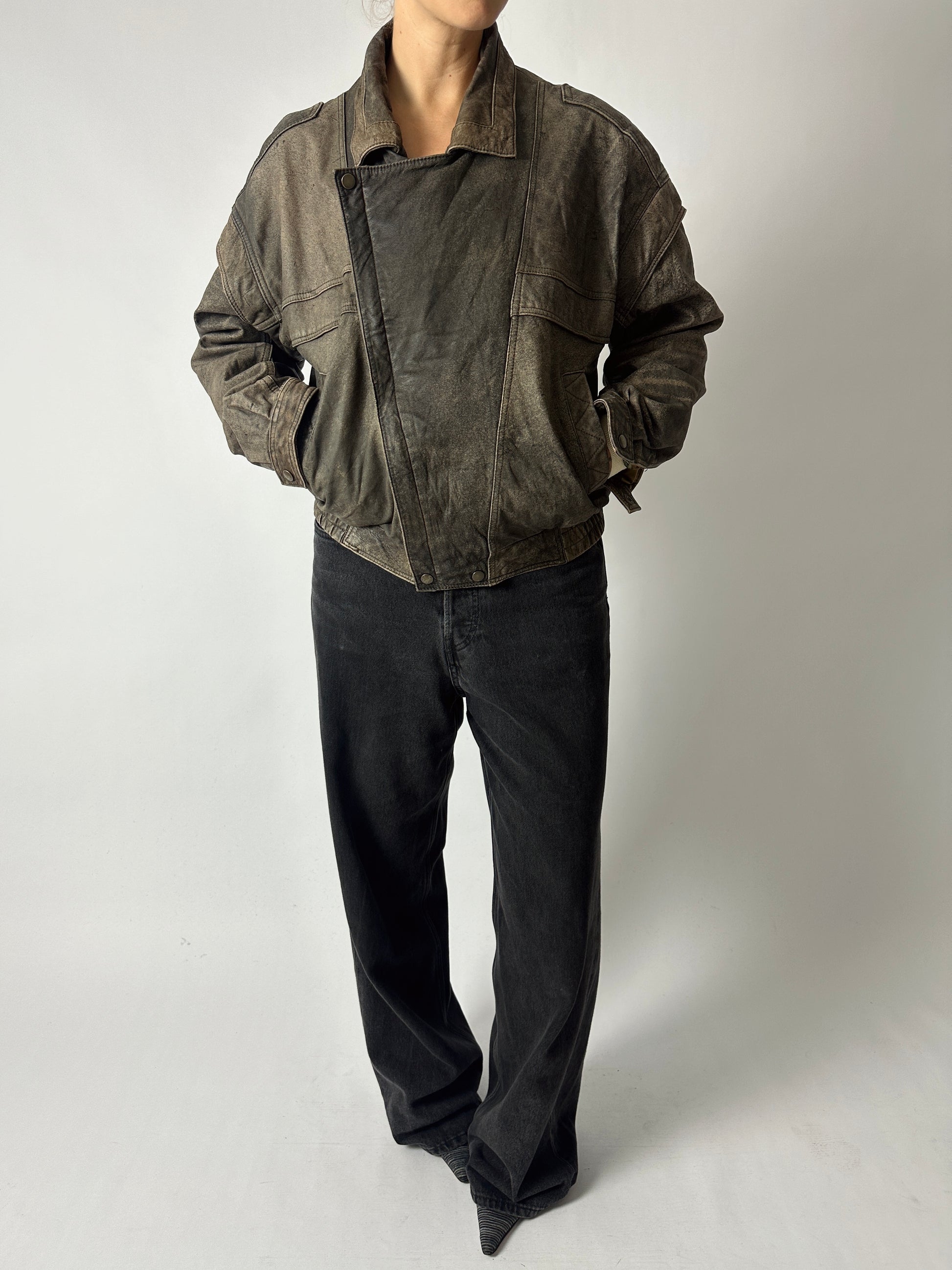 This distressed leather bomber jacket features a relaxed silhouette with dropped shoulders for an effortlessly cool edge. Fully lined for comfort, it’s finished with a side zip closure and functional side pockets.
