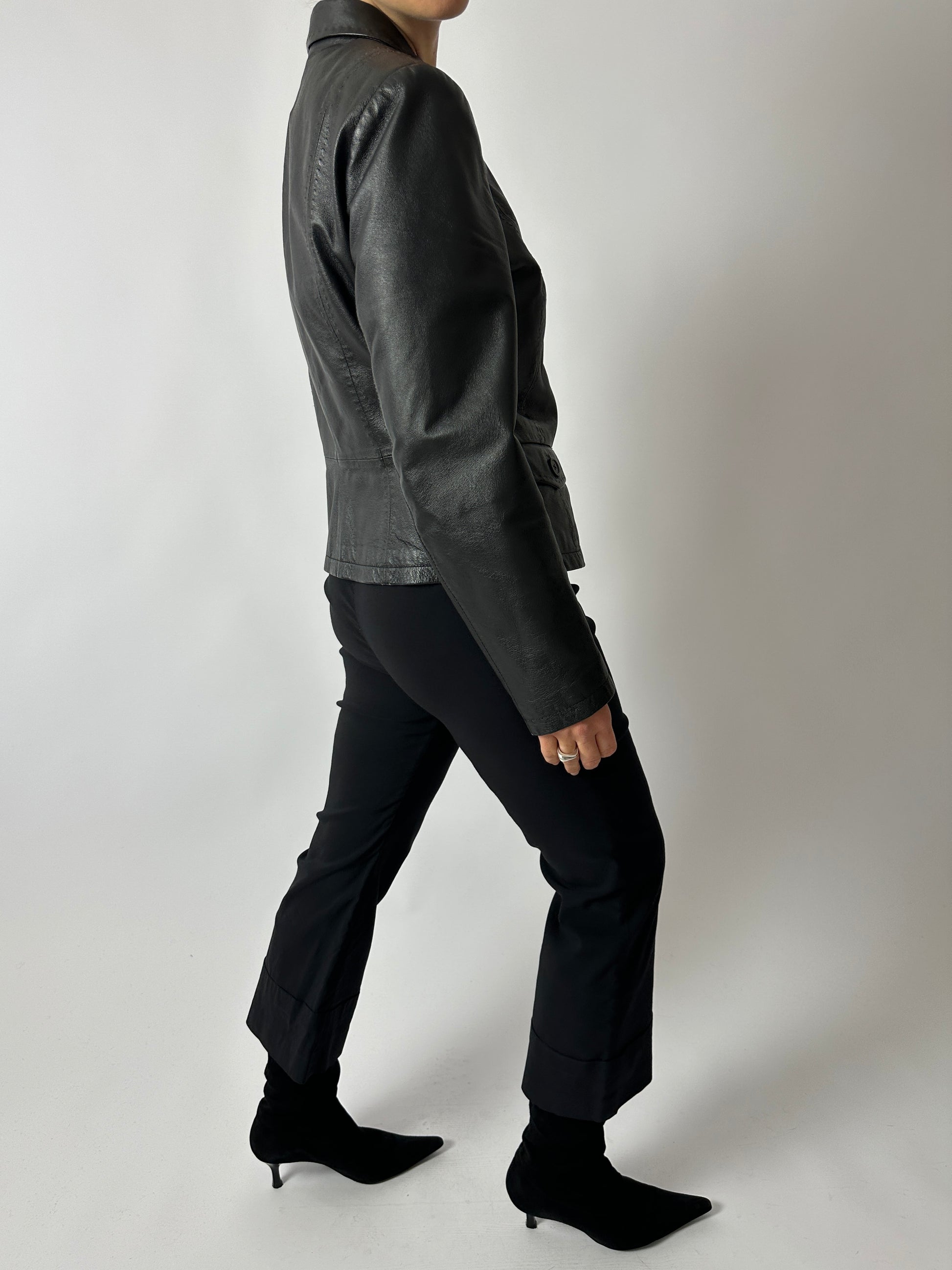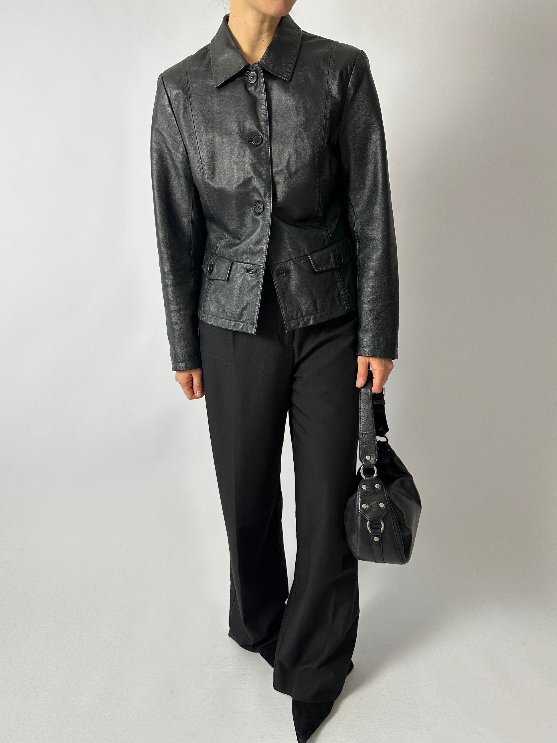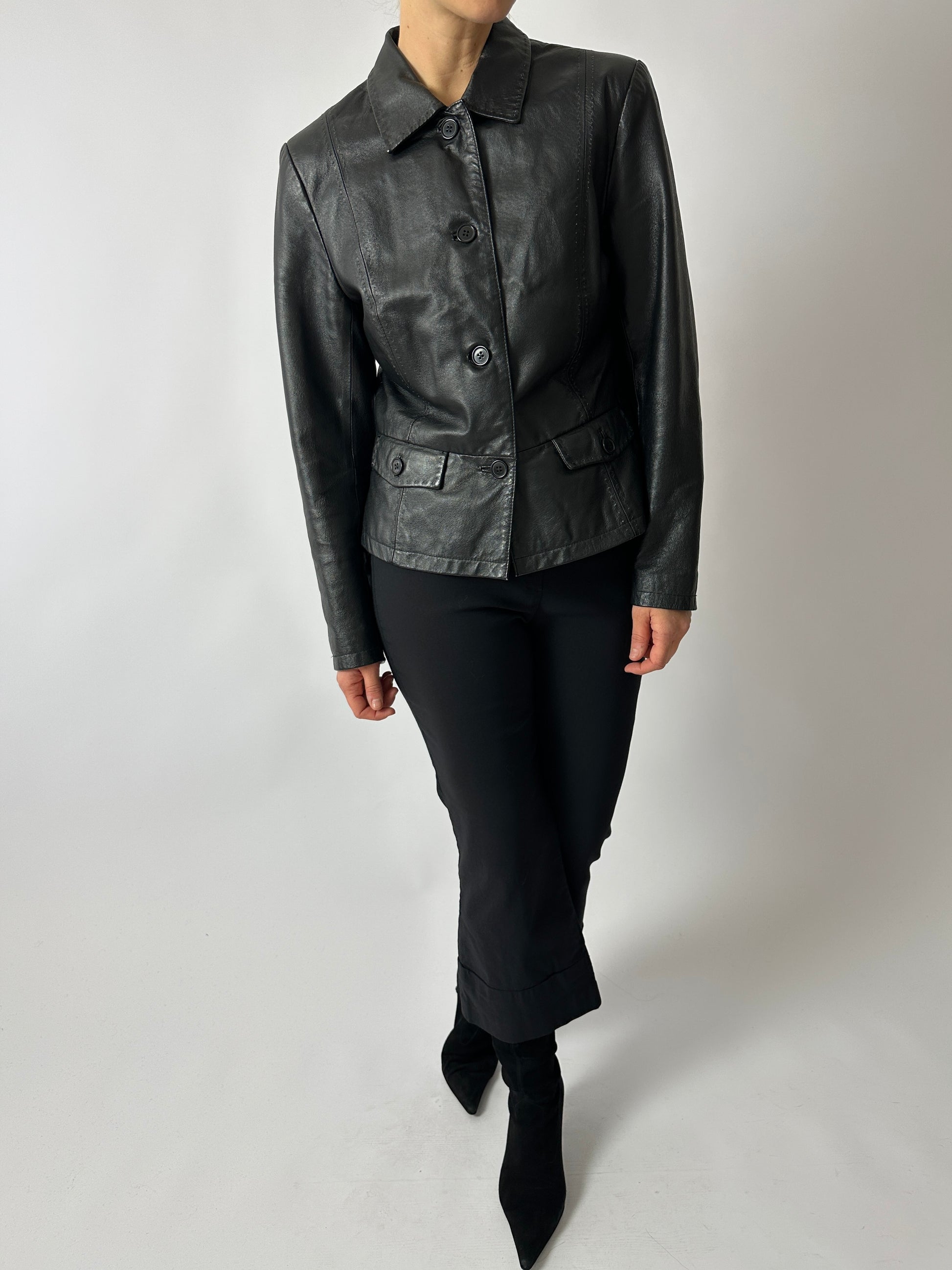 A fitted leather jacket with a button closure and front flap pockets. Fully lined for a refined finish, it offers a sleek, timeless silhouette.