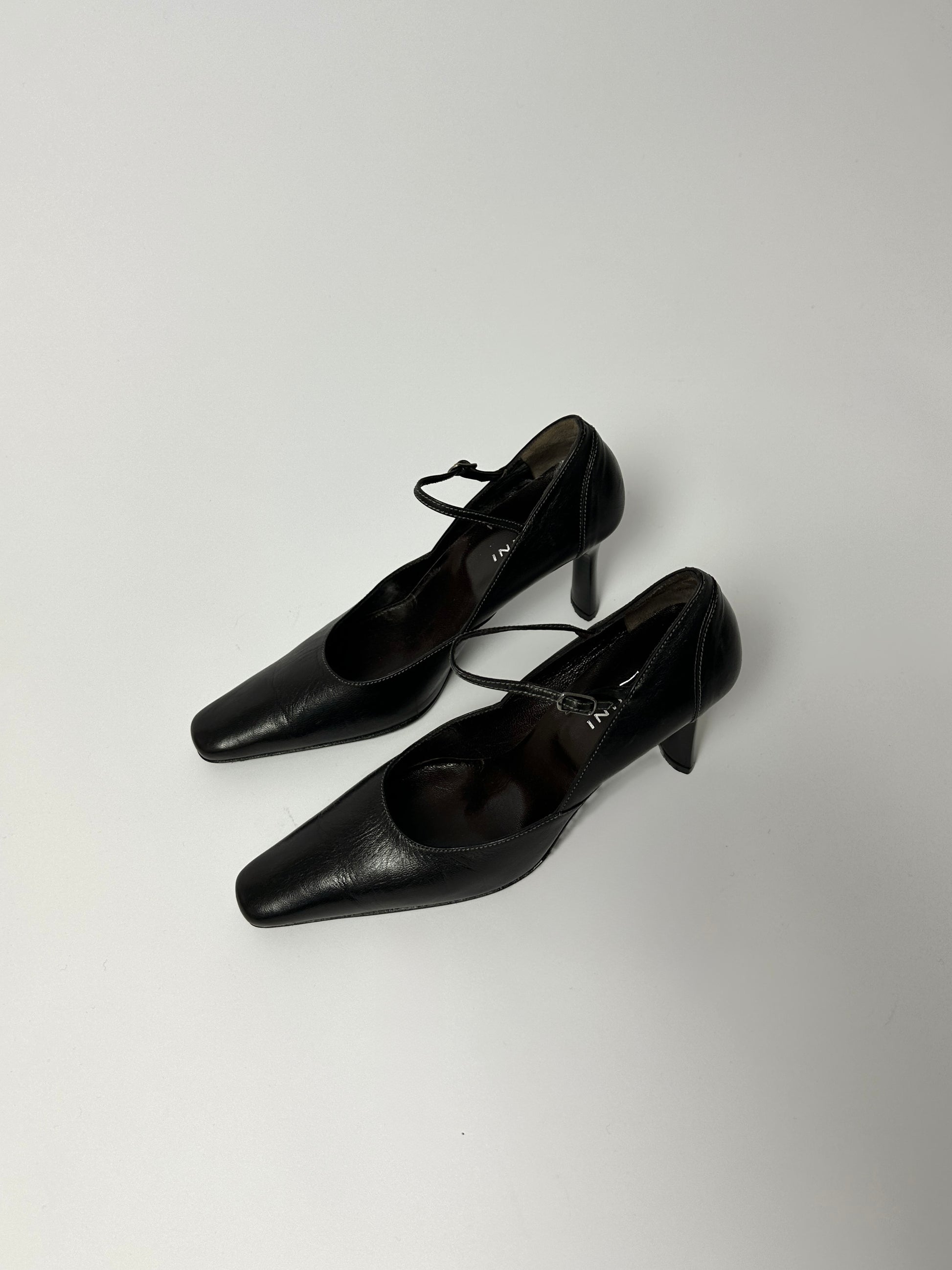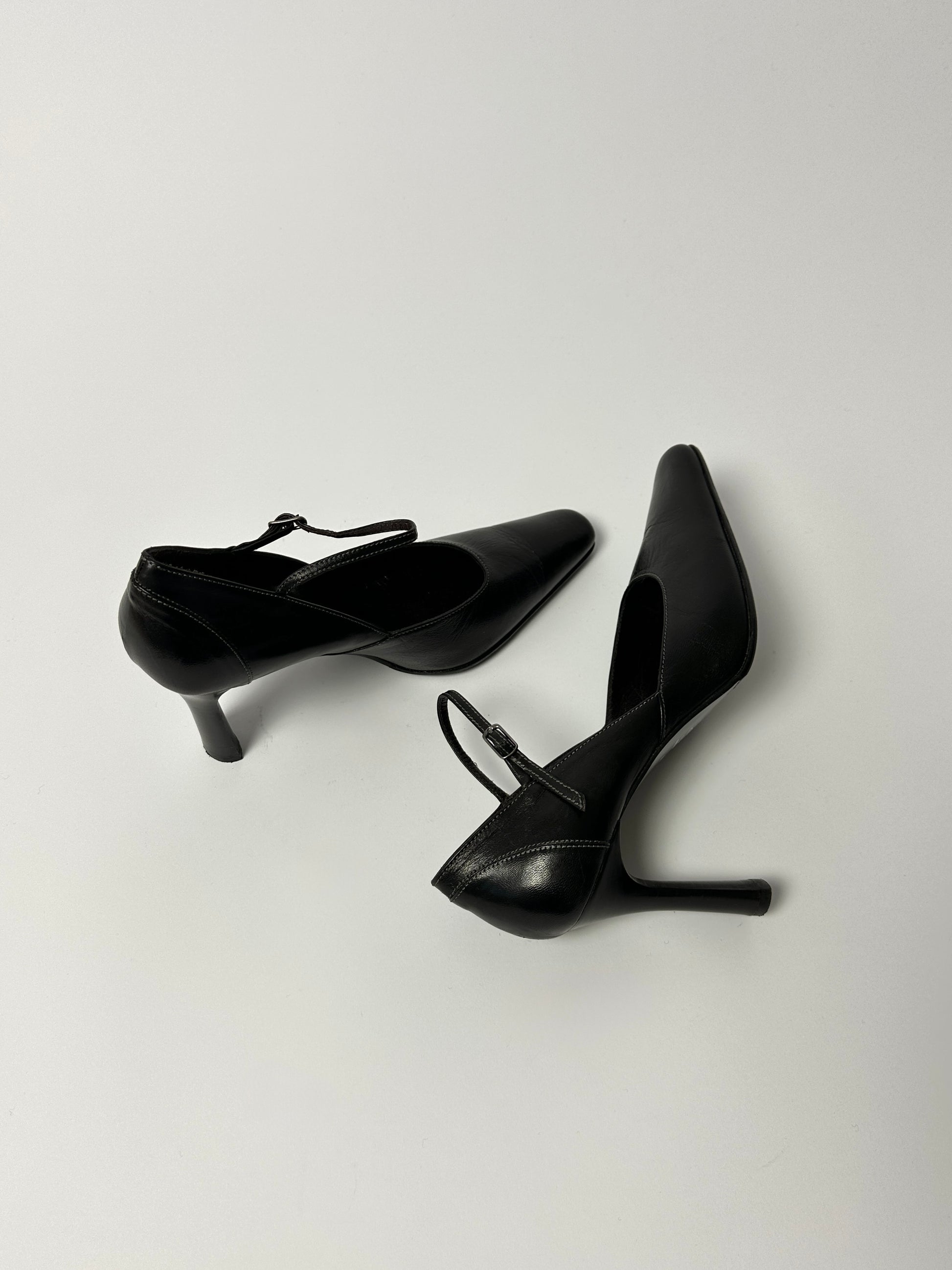 These leather heels feature a sleek 9 cm heel and a refined pointed toe, crafted in a deep, ultra–dark brown hue for a sophisticated finish.