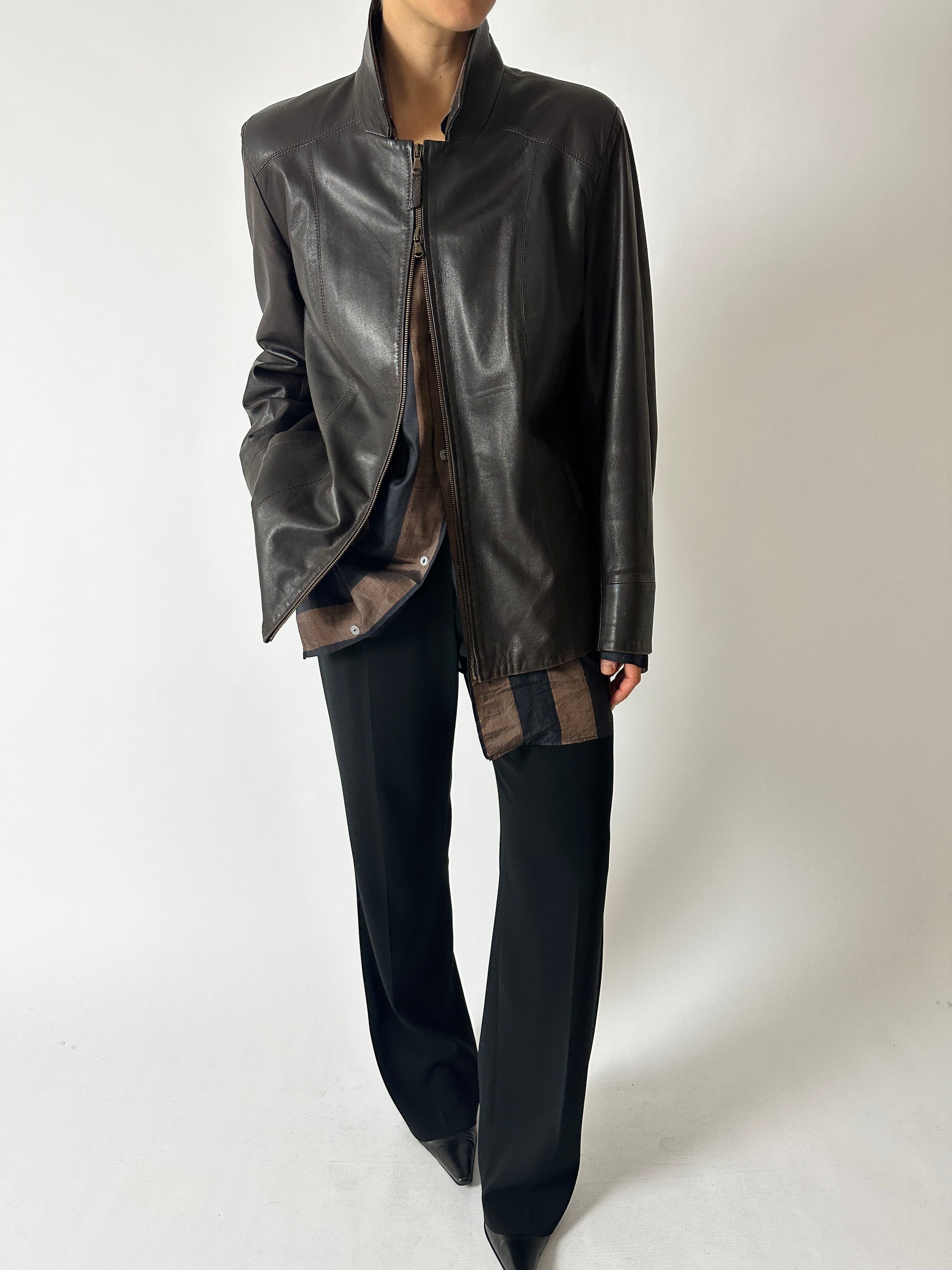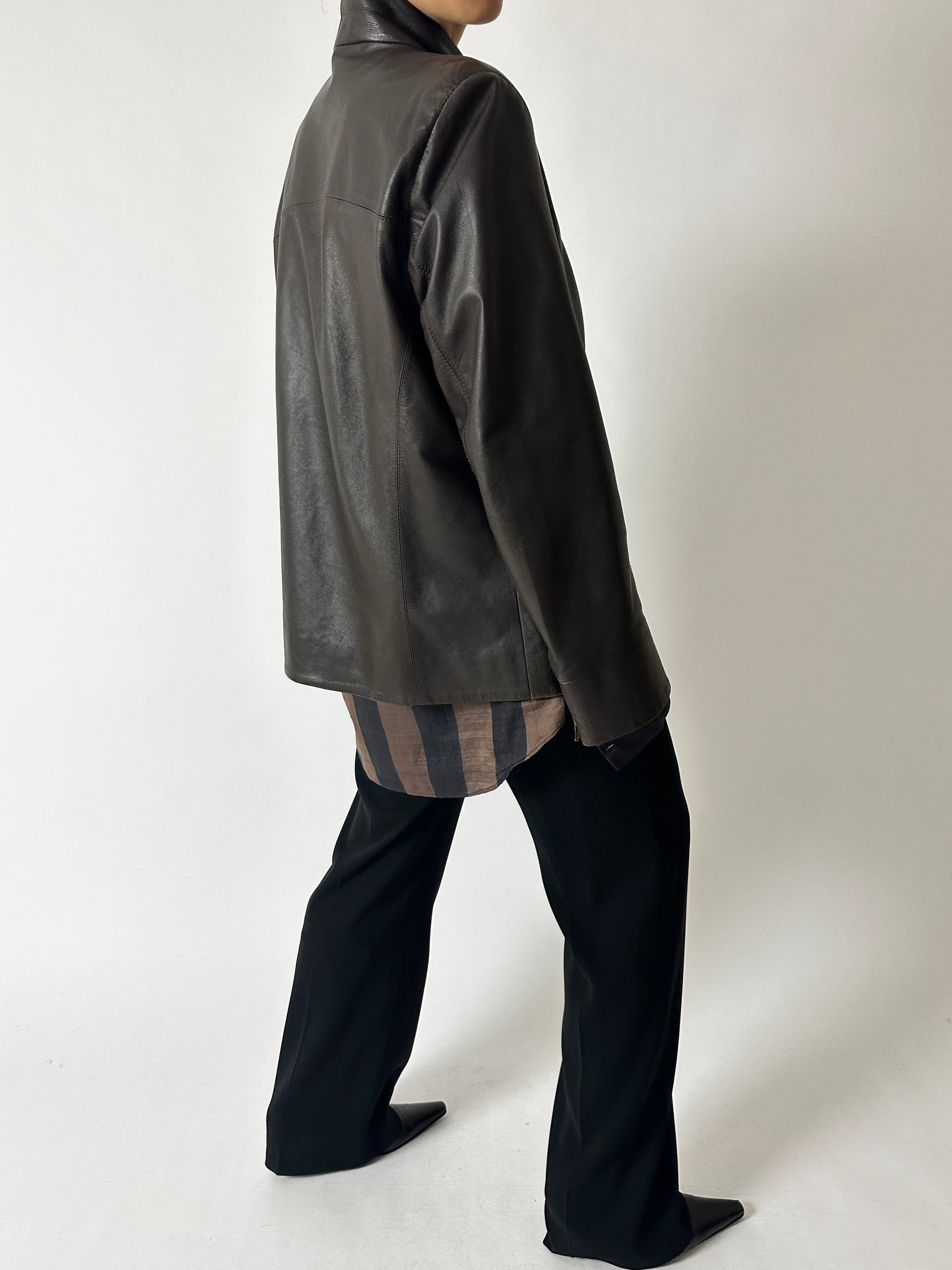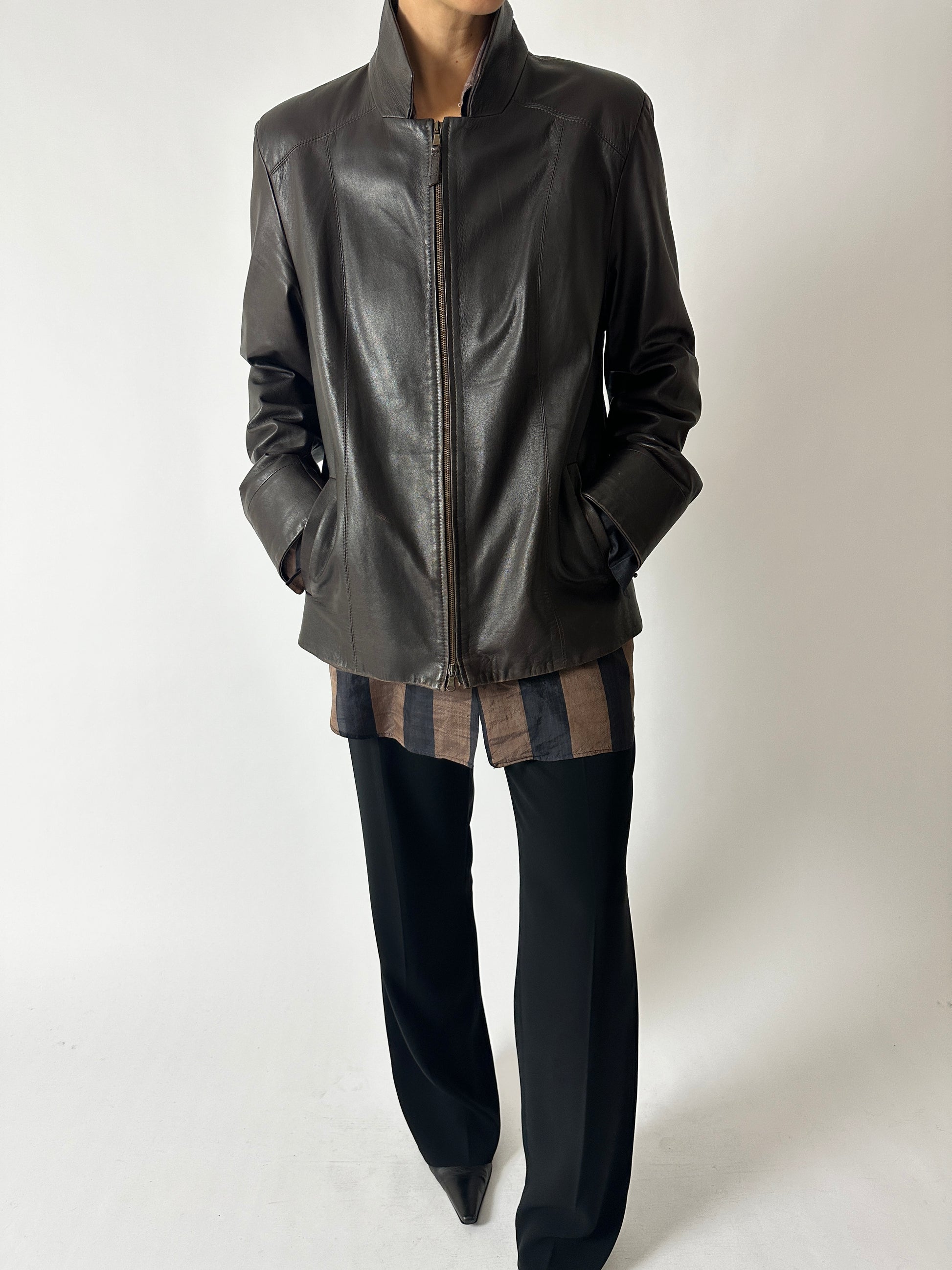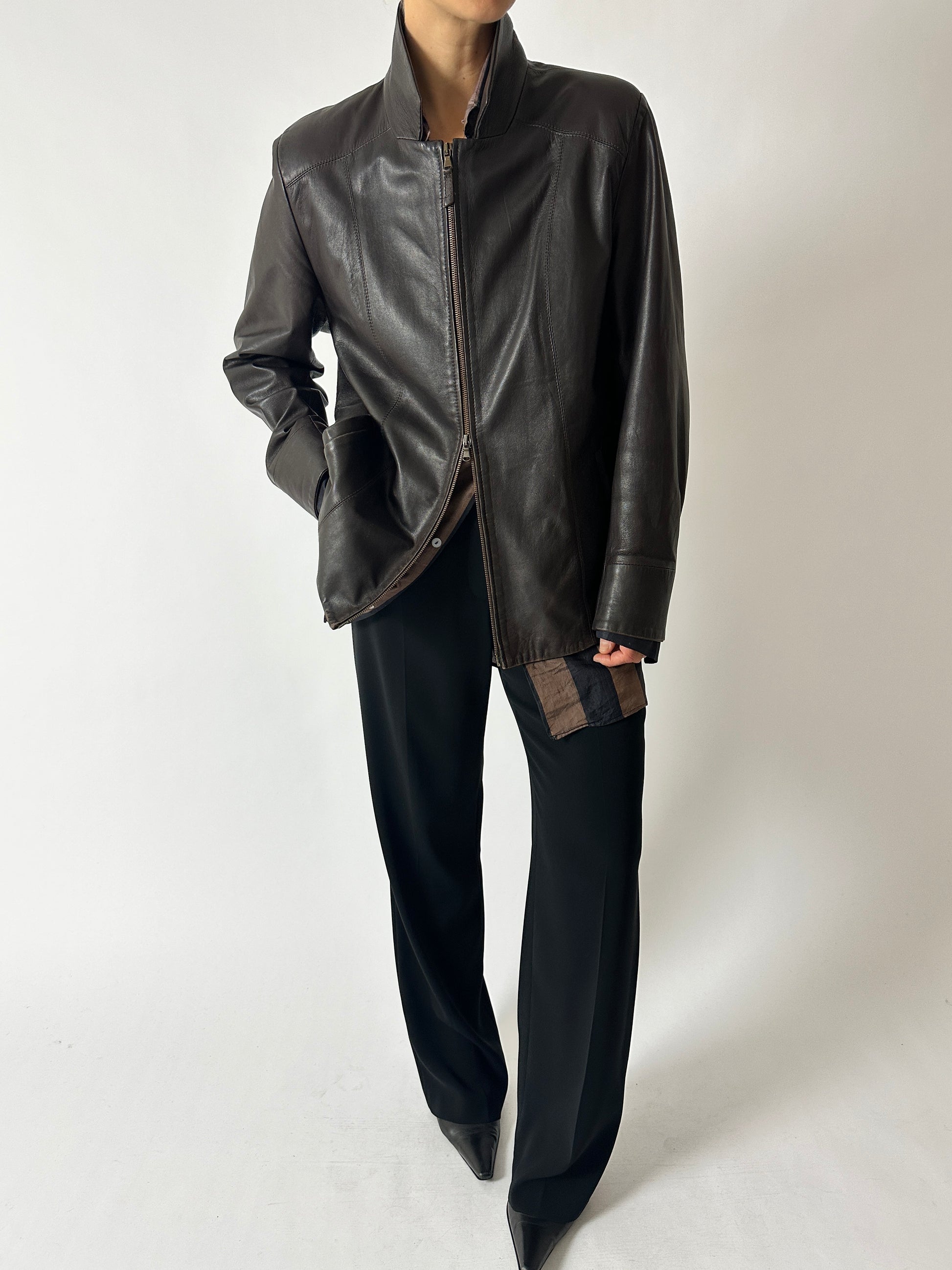 Made from soft-feel leather in a rich dark brown, this fully lined jacket is cut to a clean, minimalist silhouette. A two-way zip fastening adds versatile styling, complemented by side pockets and zip details at the sleeve ends.