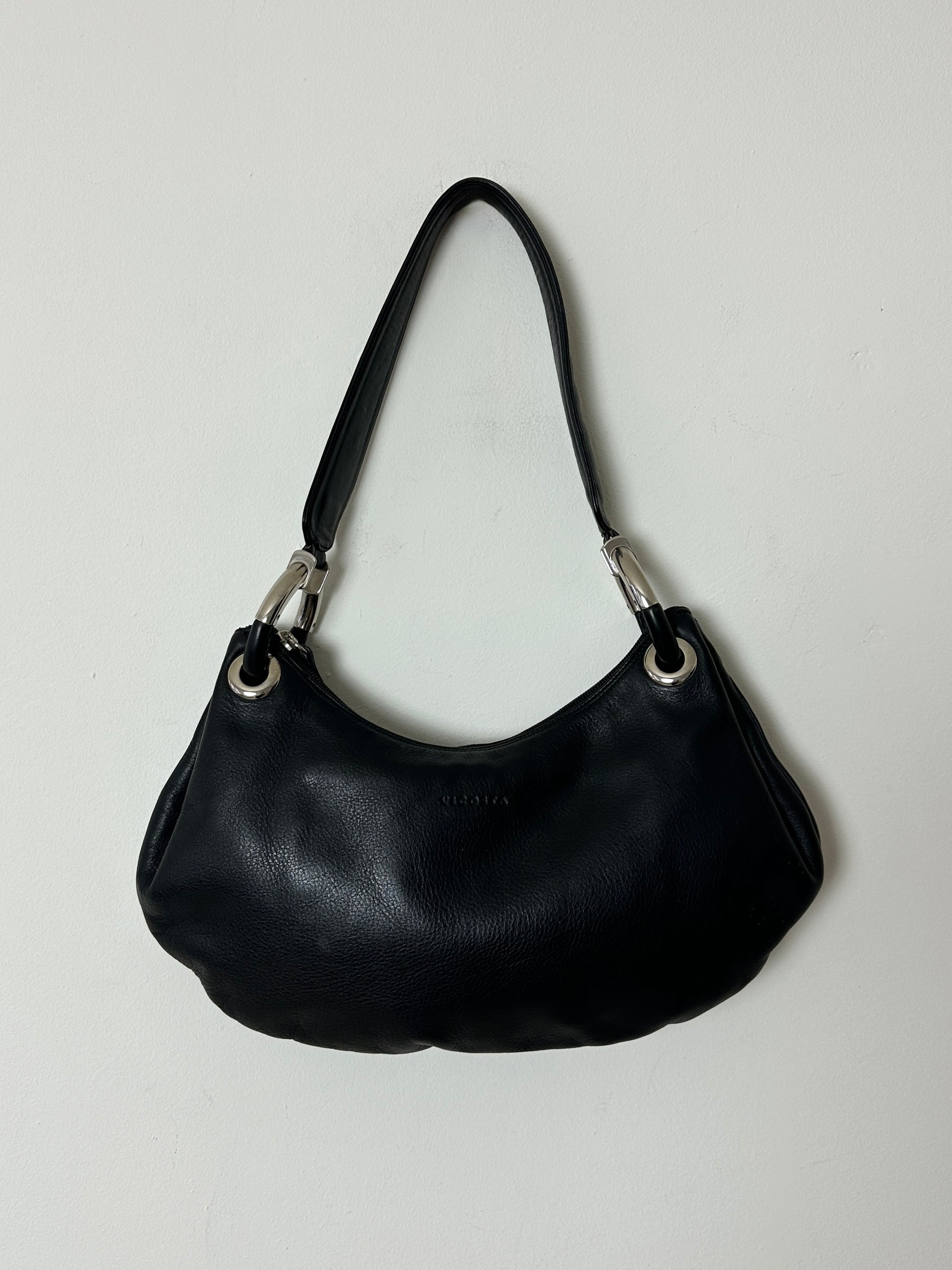 This sleek shoulder bag is crafted in smooth black leather, featuring a clean, modern silhouette with multiple interior pockets and a silver-ring detail along the strap for a refined finish.