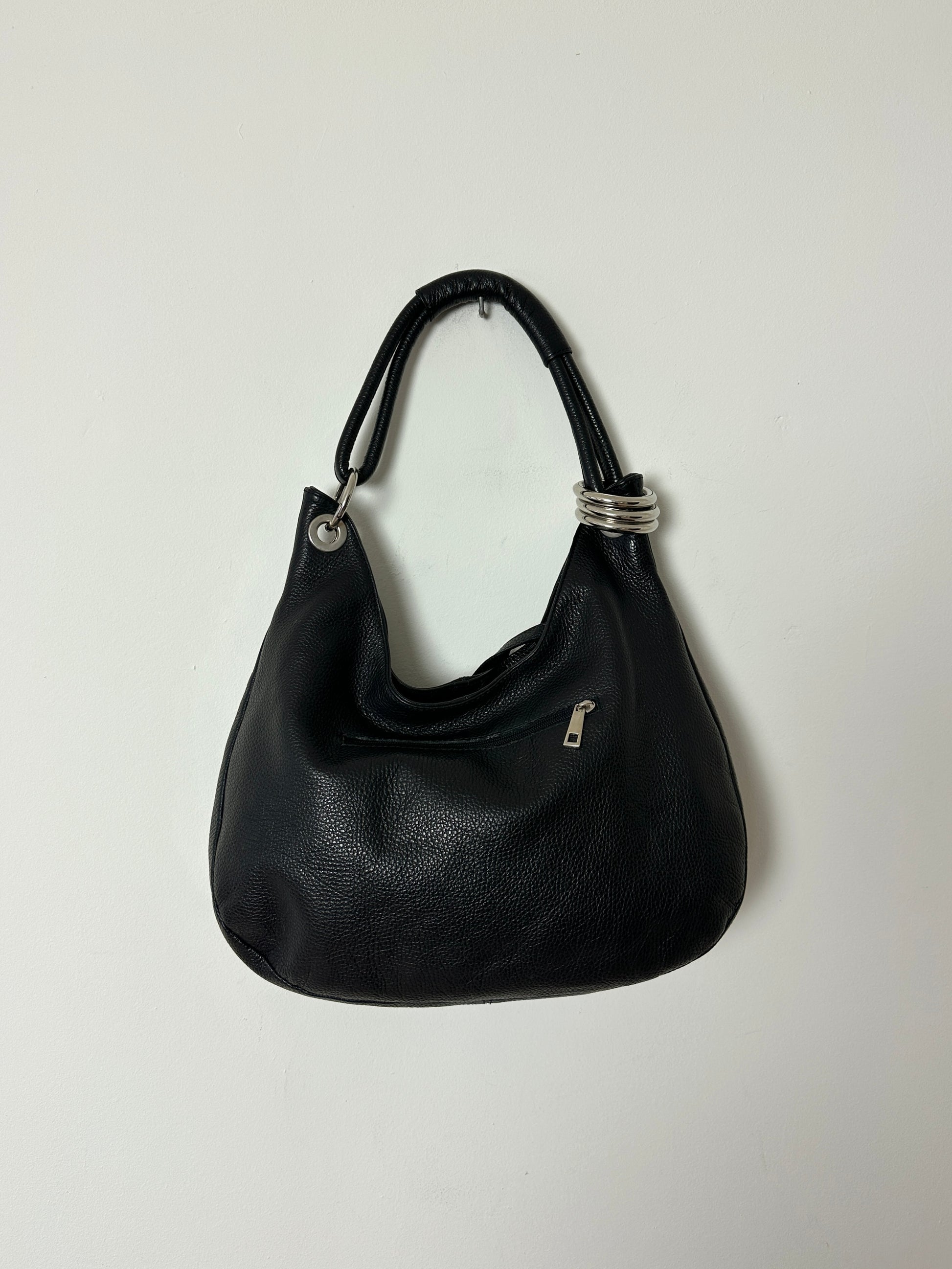 This large shoulder bag is crafted in smooth black leather, featuring a clean, modern silhouette with multiple interior pockets and a silver-ring detail along the strap for a refined finish.