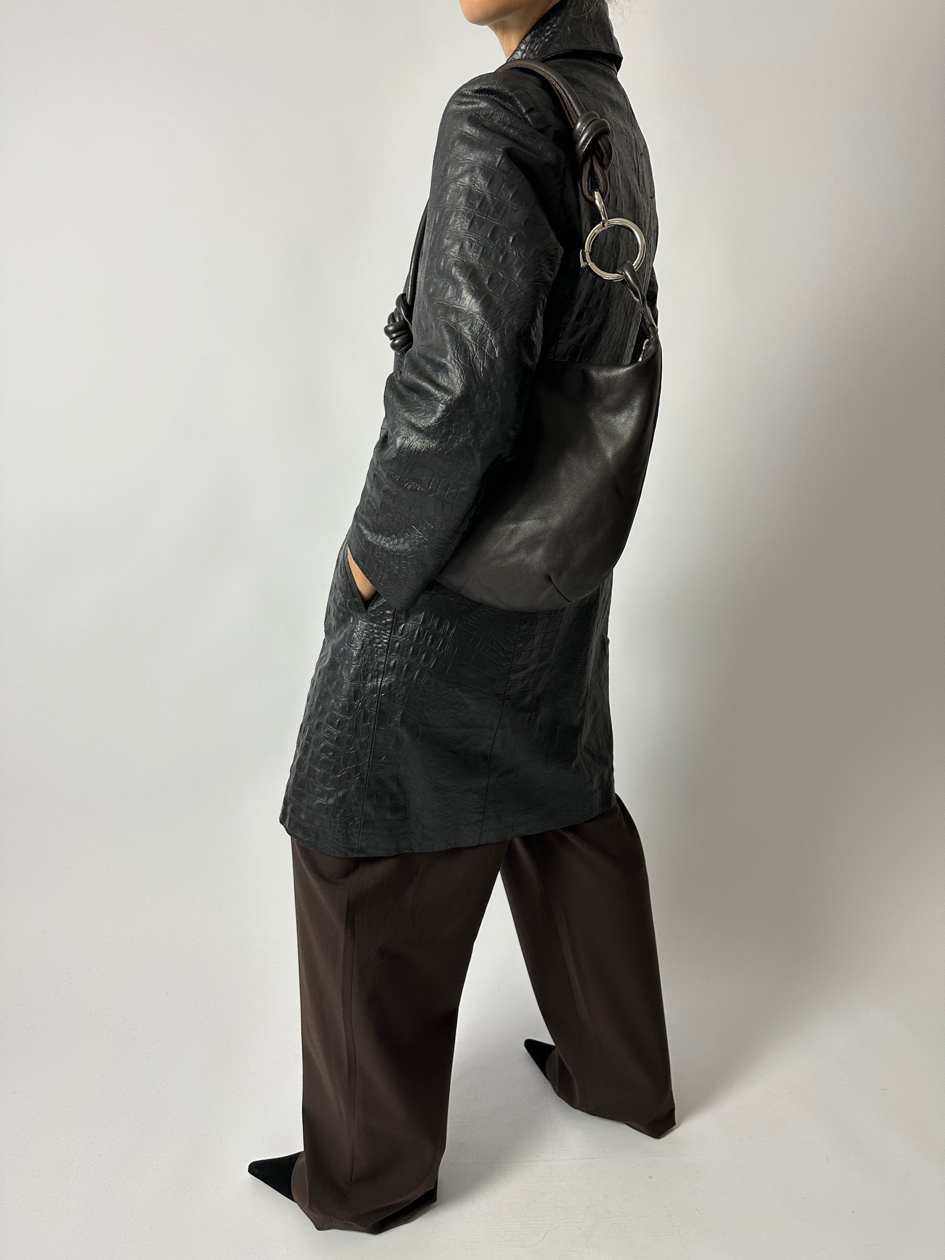 This sleek shoulder bag is crafted in smooth dark brown leather, featuring a clean, modern silhouette with multiple interior pockets and a silver-ring detail along the strap for a refined finish.