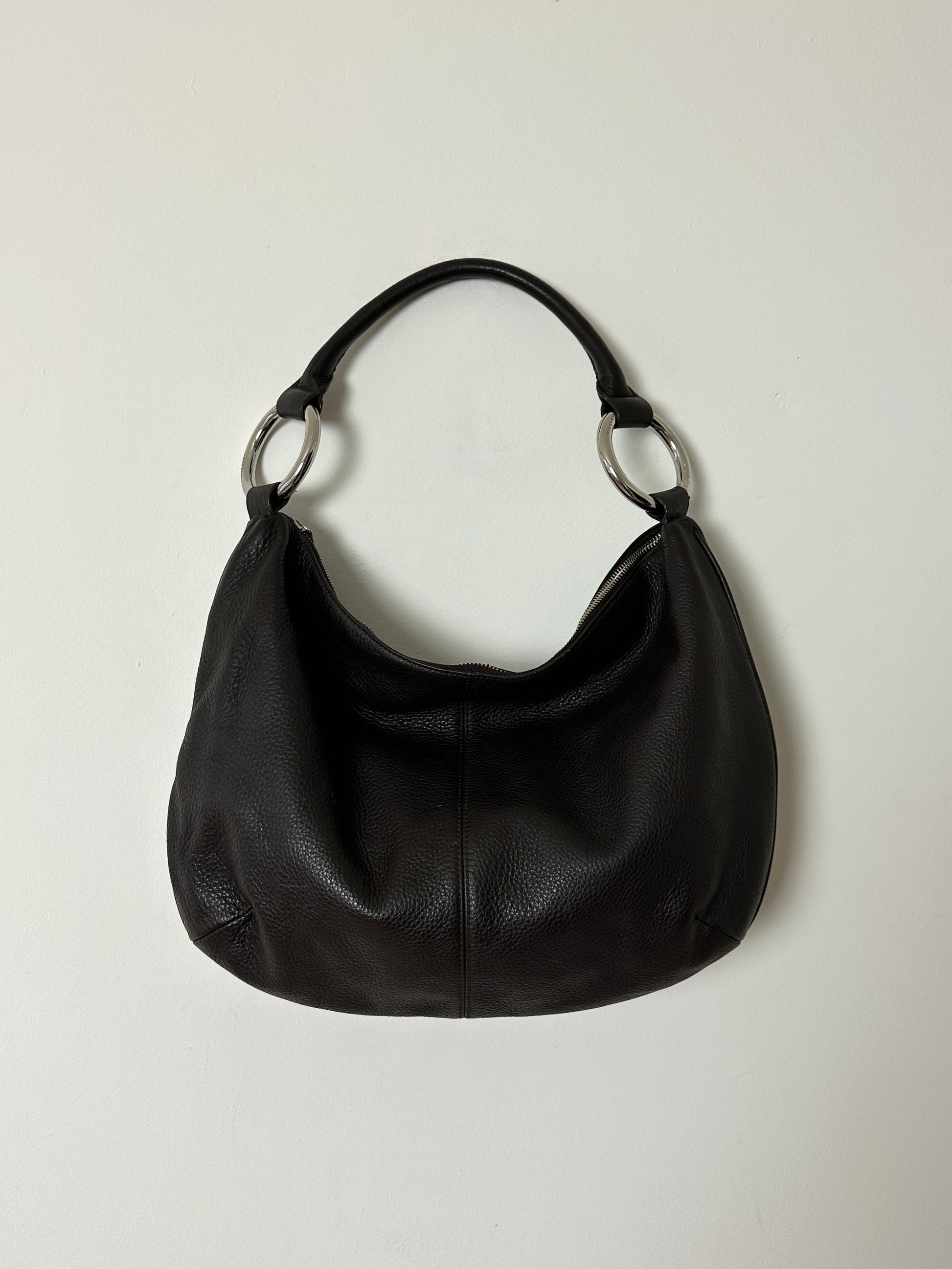 This large shoulder bag is crafted in smooth dark brown leather, featuring a clean, modern silhouette with multiple interior pockets and a silver-ring detail along the strap for a refined finish.