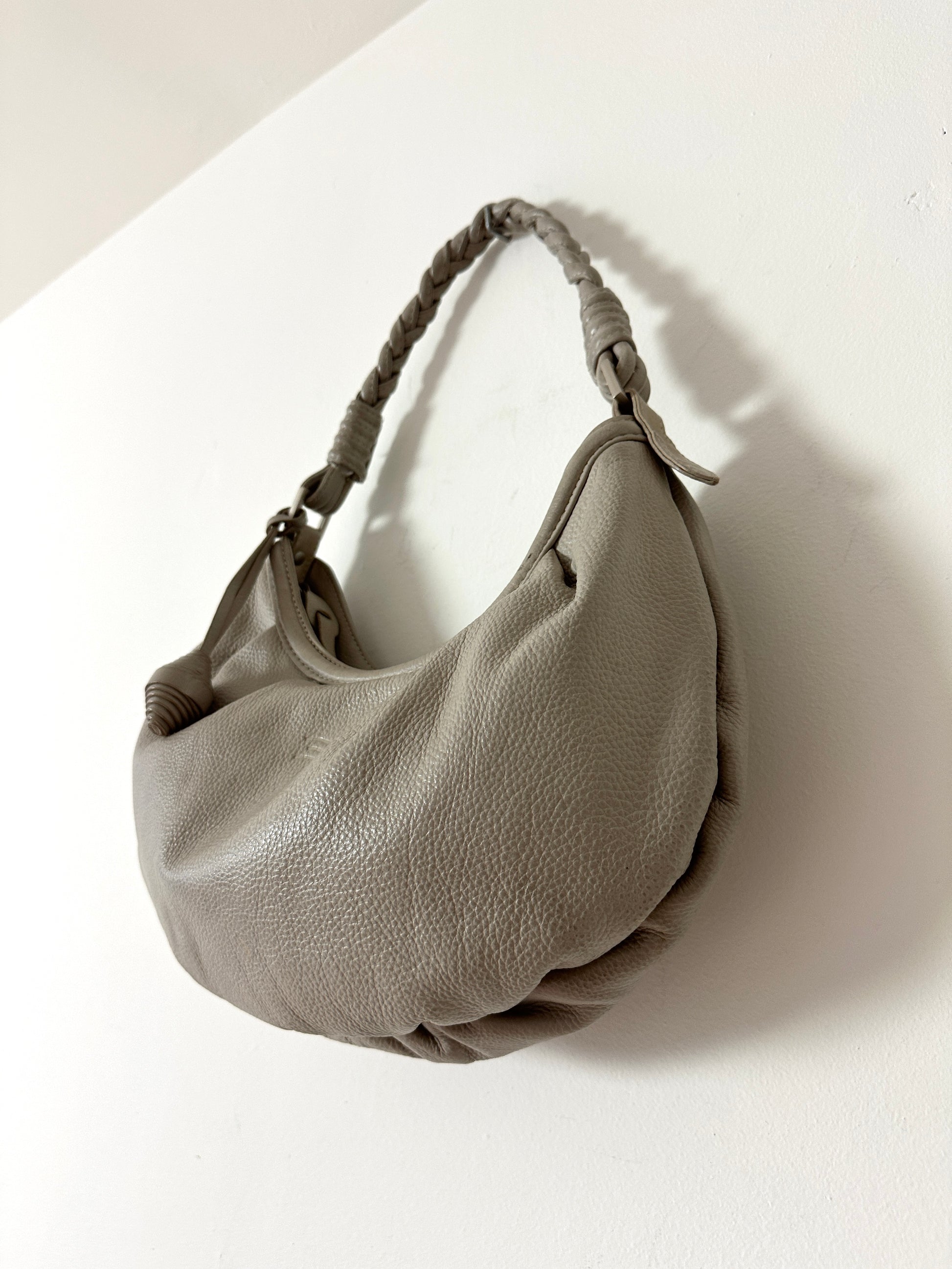 Crafted in smooth leather, this moon-shaped shoulder bag is finished with a braided handle for added detail. It closes with a top zip and features a small interior zip pocket to keep essentials secure.