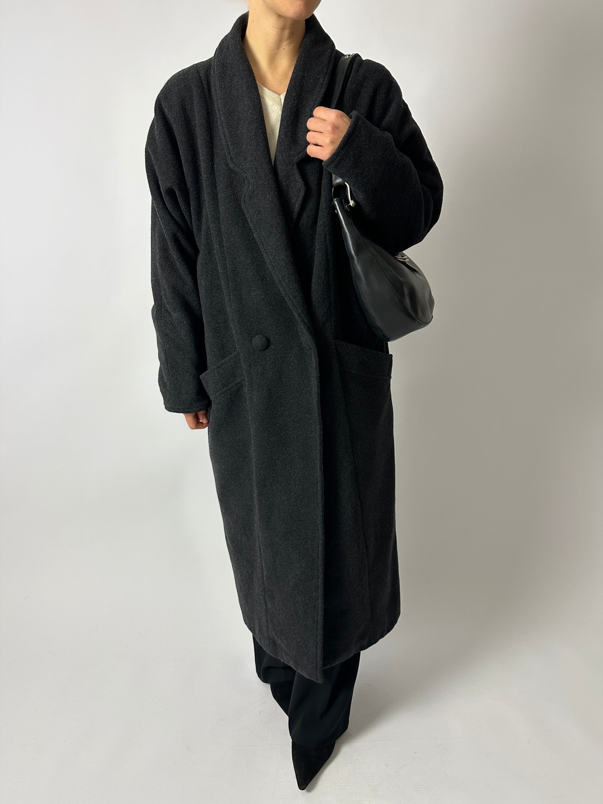 This long coat is crafted from a wool blend, offering warmth and a soft drape. Featuring dolman sleeves, a double-button closure, side pockets, and a fully lined interior, it has a relaxed, effortless silhouette.