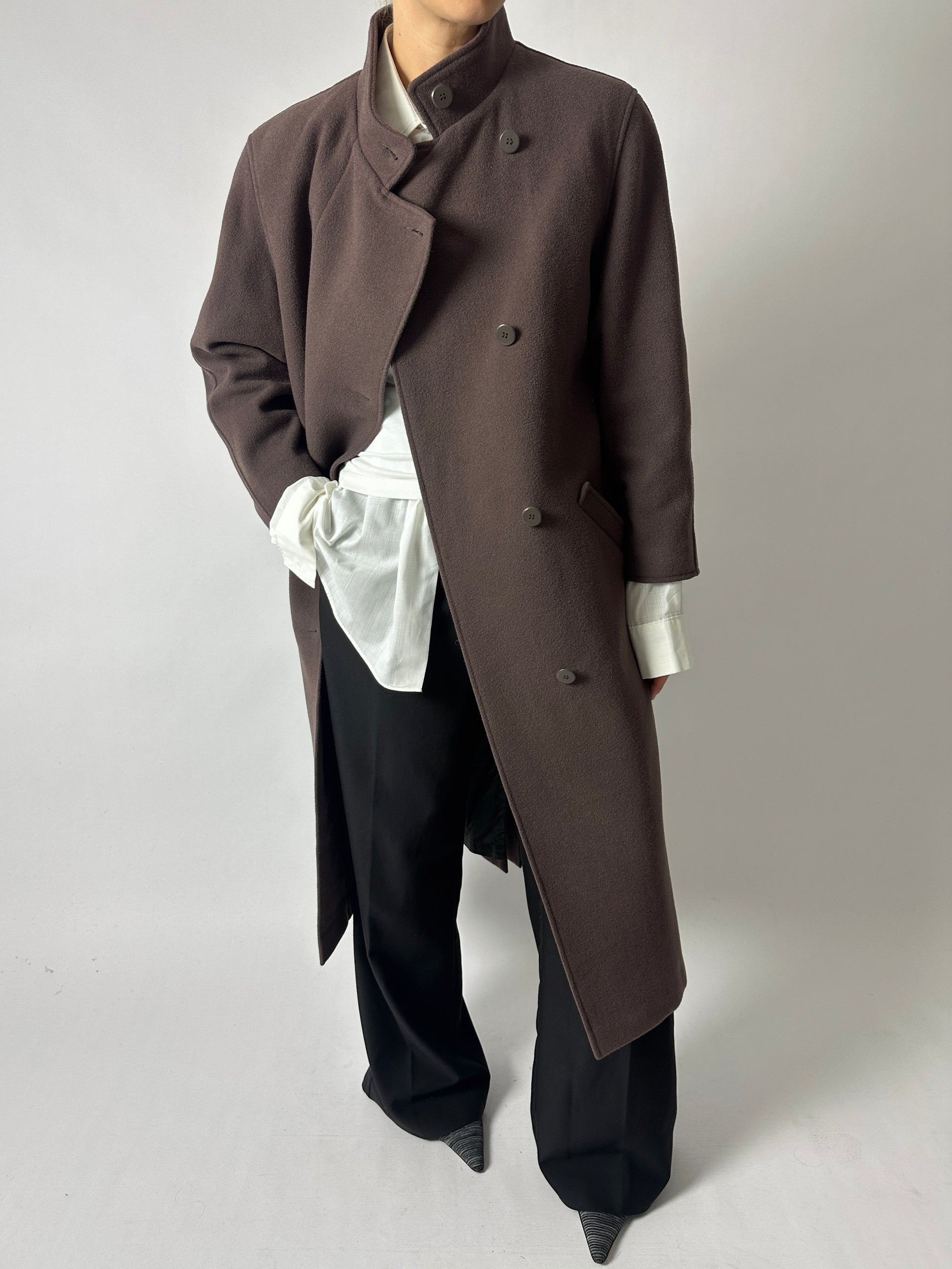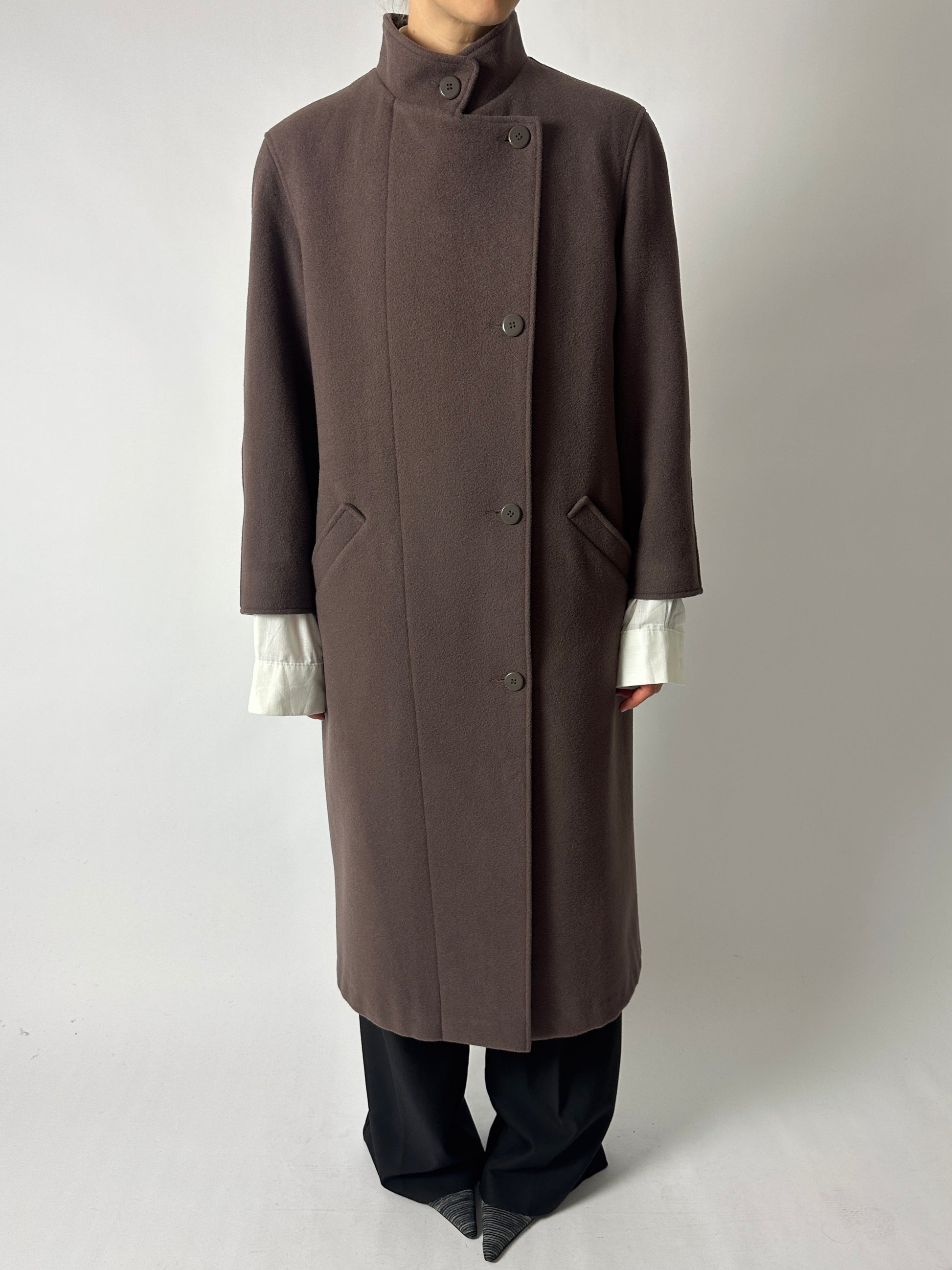 This long coat is crafted from premium wool, providing warmth and a soft yet structured drape. Fully lined and designed with side pockets, a side-way button closure, and a stand-up collar, it features a relaxed, effortless silhouette. Made in Finland.