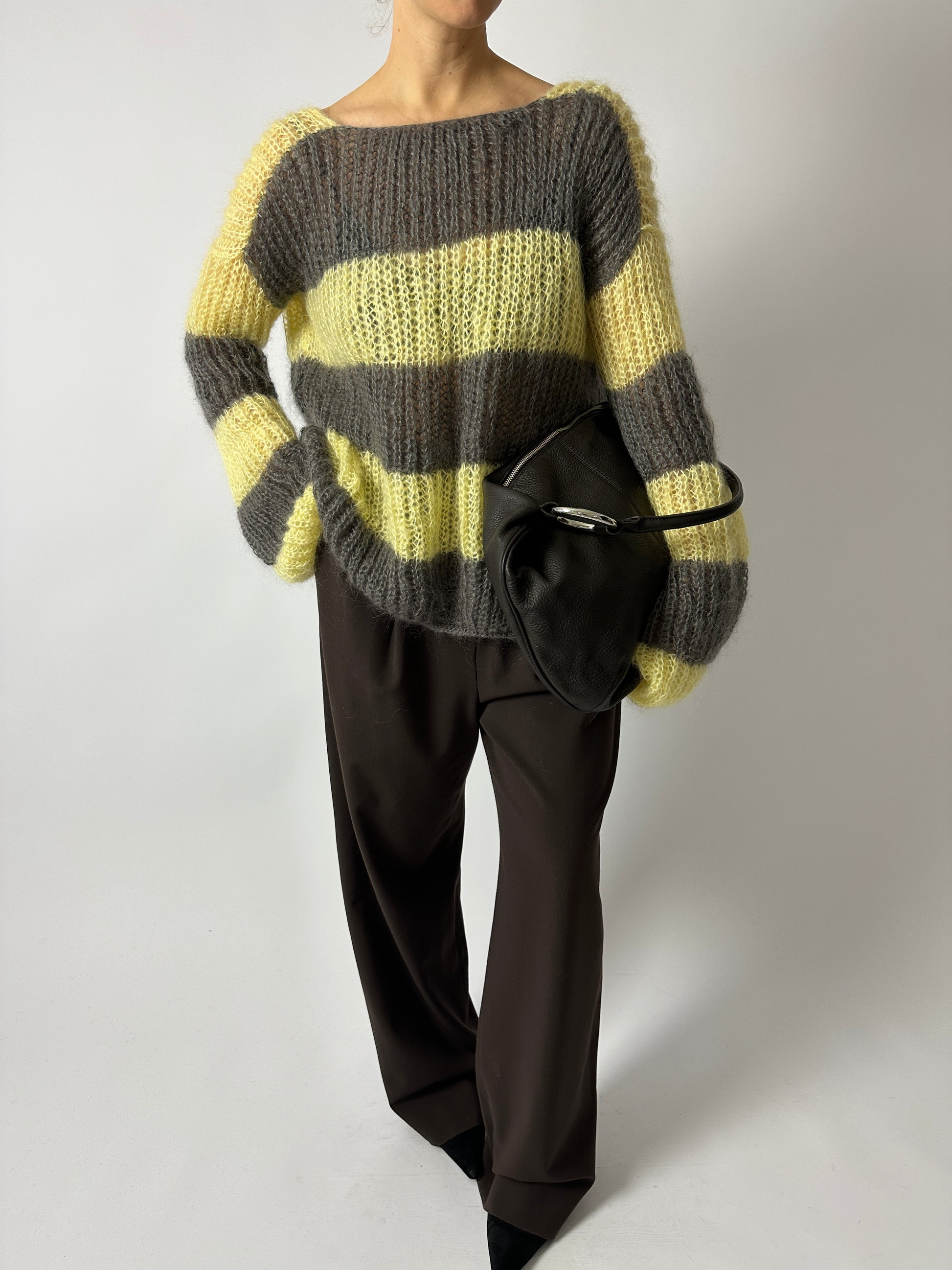 This mohair striped sweater features an oversized, chunky fit with a round neckline and soft balloon sleeves.