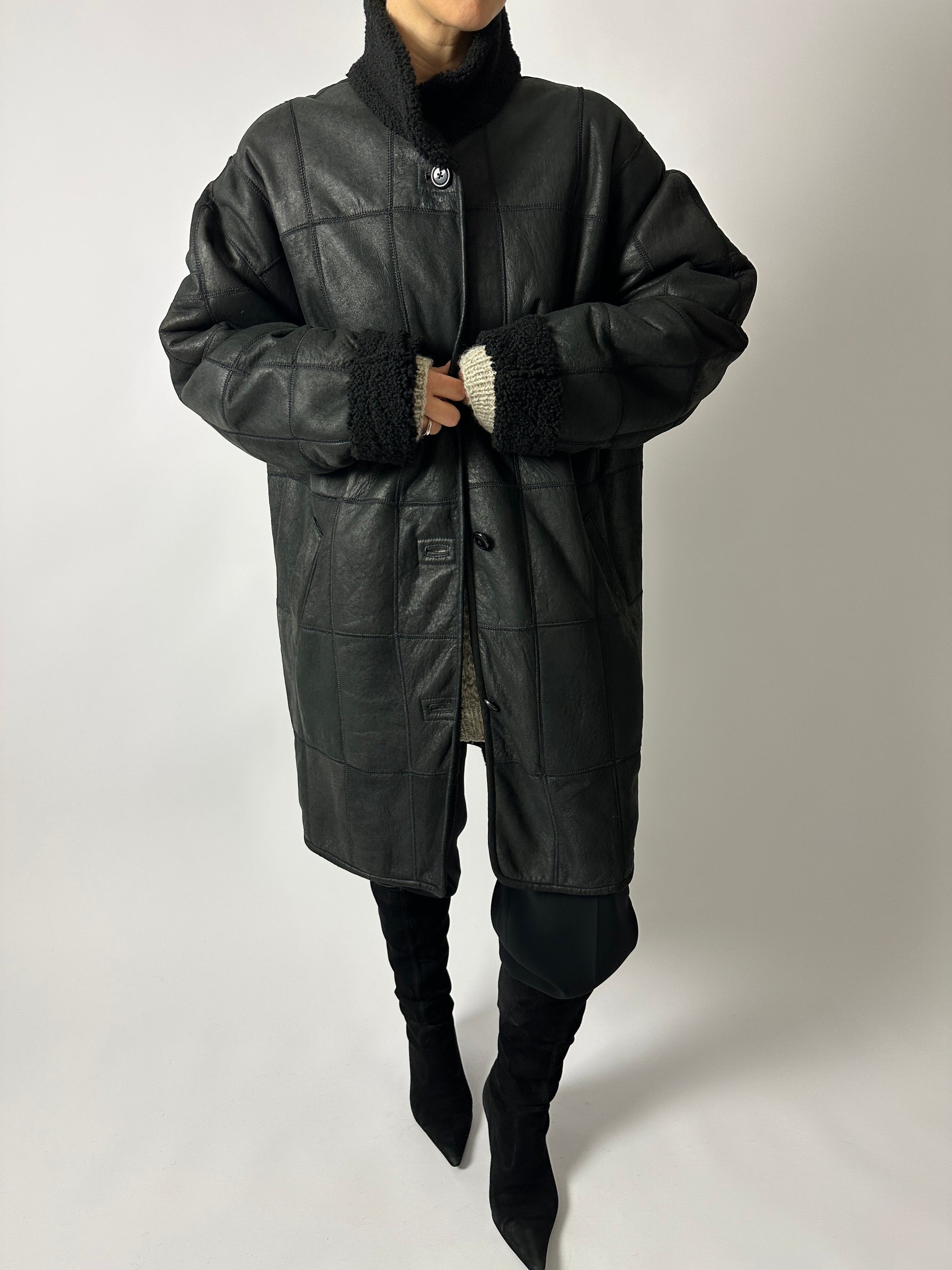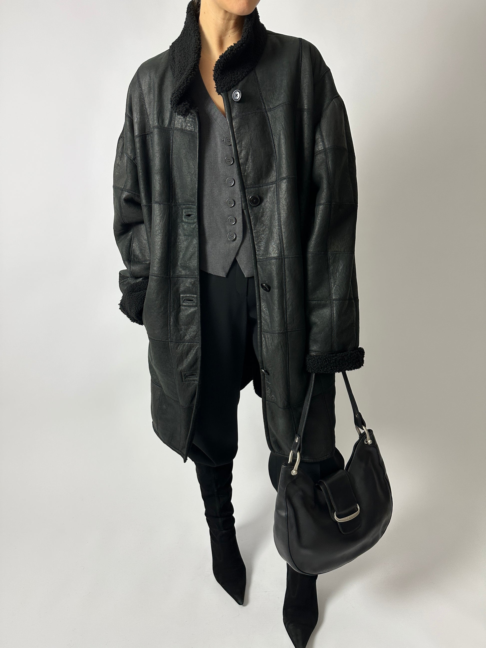 This long original shearling coat offers natural warmth and a soft, oversized drape. Finished with side pockets and a button-front closure, it has a relaxed, effortless silhouette.