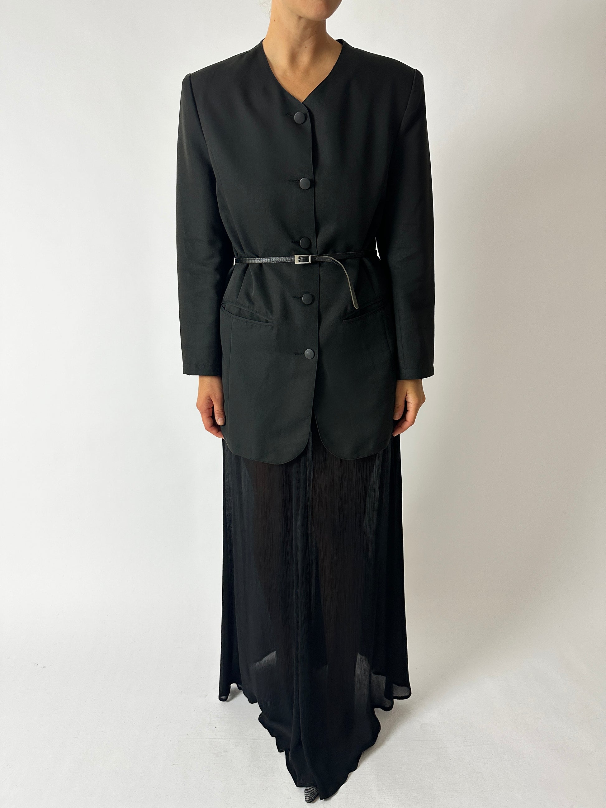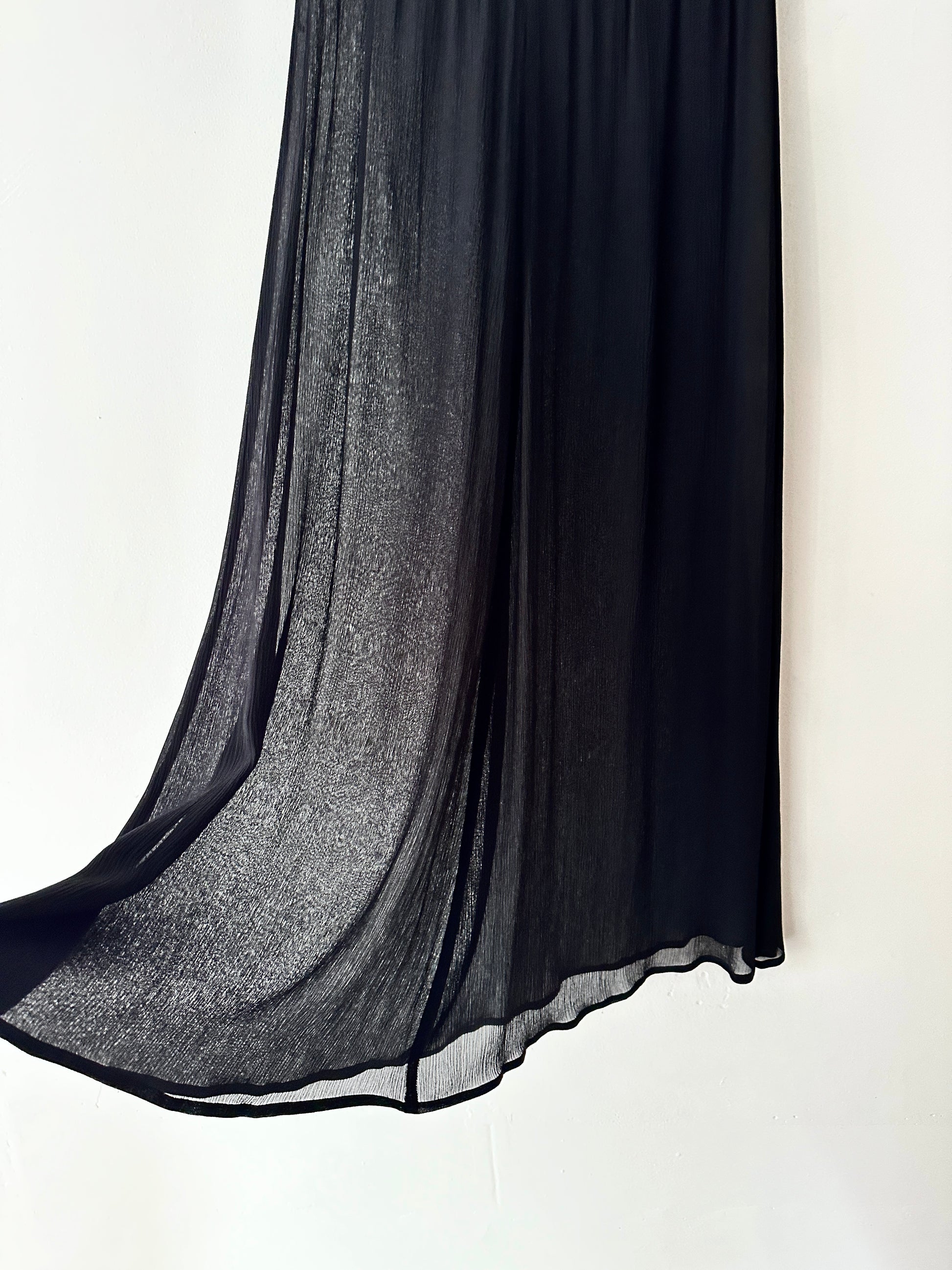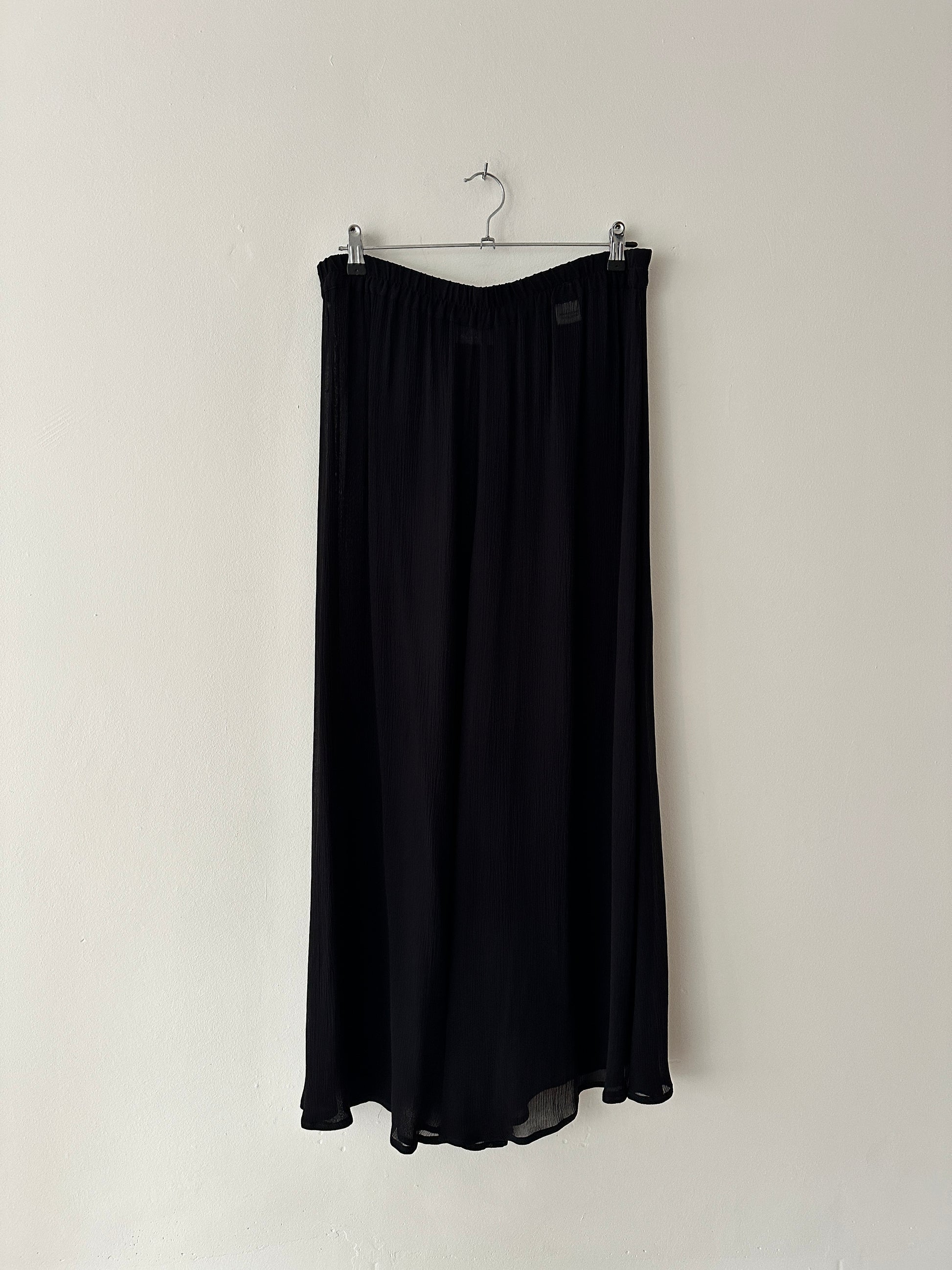 Sheer and fluid, this black maxi skirt falls in soft pleats and sits comfortably at the waist with a low elastic band.