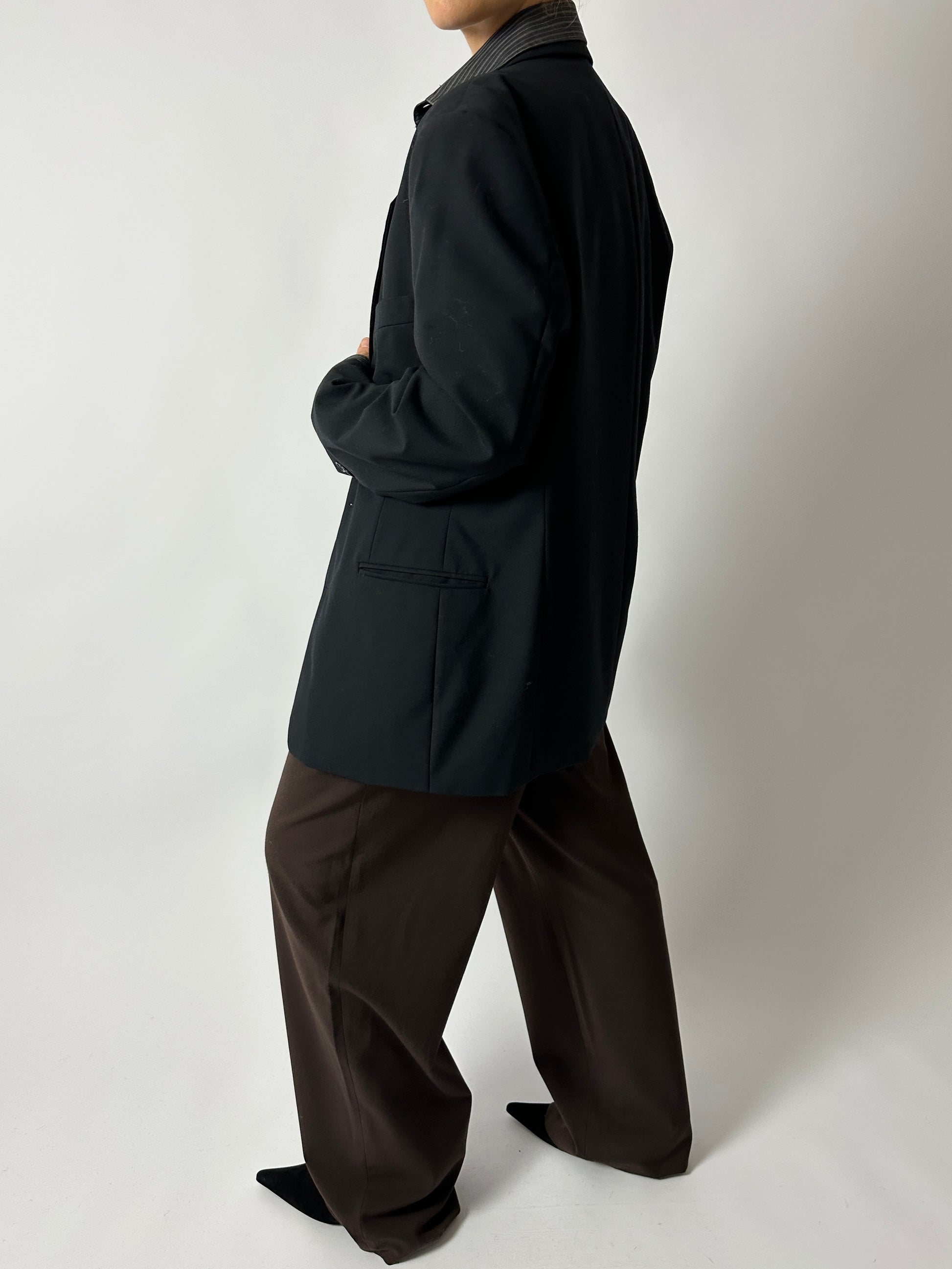 Black blazer in lightweight wool blend, featuring a classic silhouette with a relaxed, oversized fit. A versatile piece that combines timeless tailoring with effortless style.
