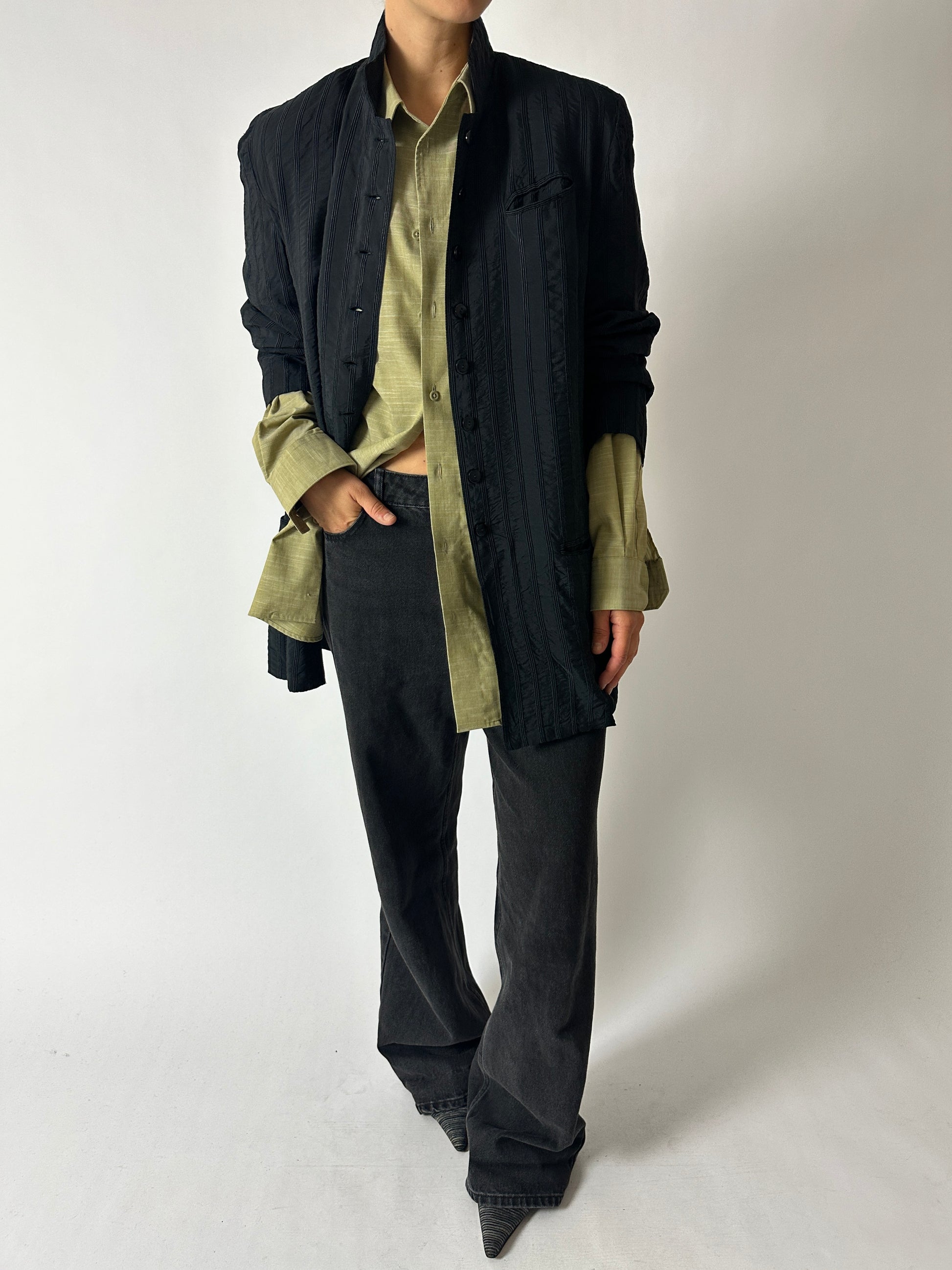 This olive melee cotton shirt features a relaxed silhouette, making it perfect for an oversized, effortless fit.