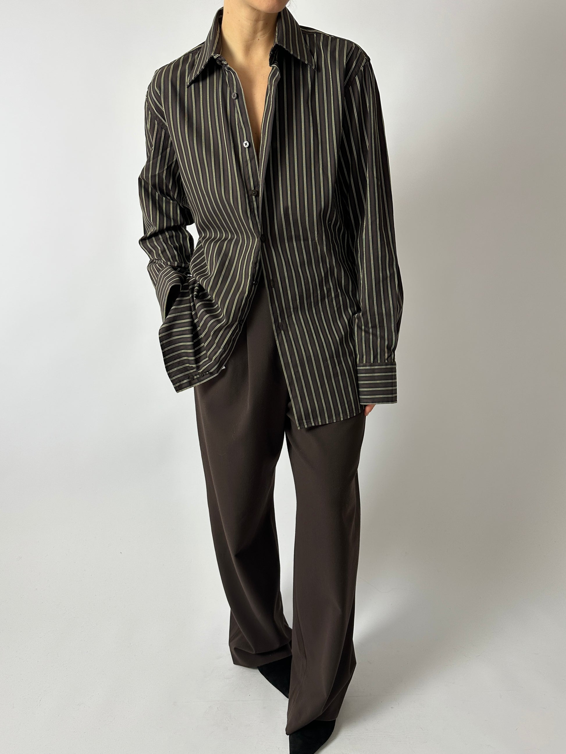 This brown black and yellow striped shirt is crafted from a soft cotton. Cut for a relaxed fit, it’s perfect to wear oversized for an effortless, laid-back look.