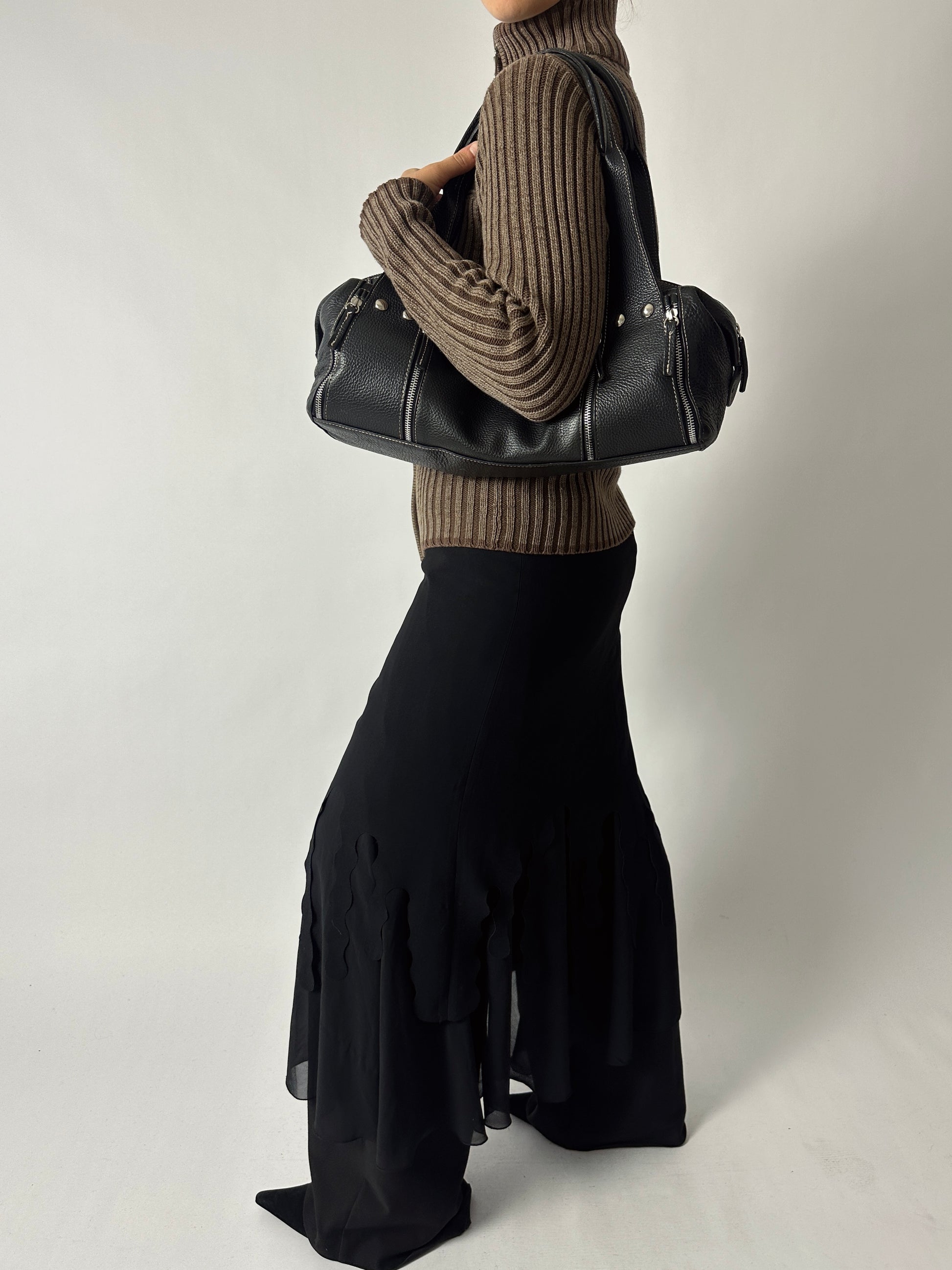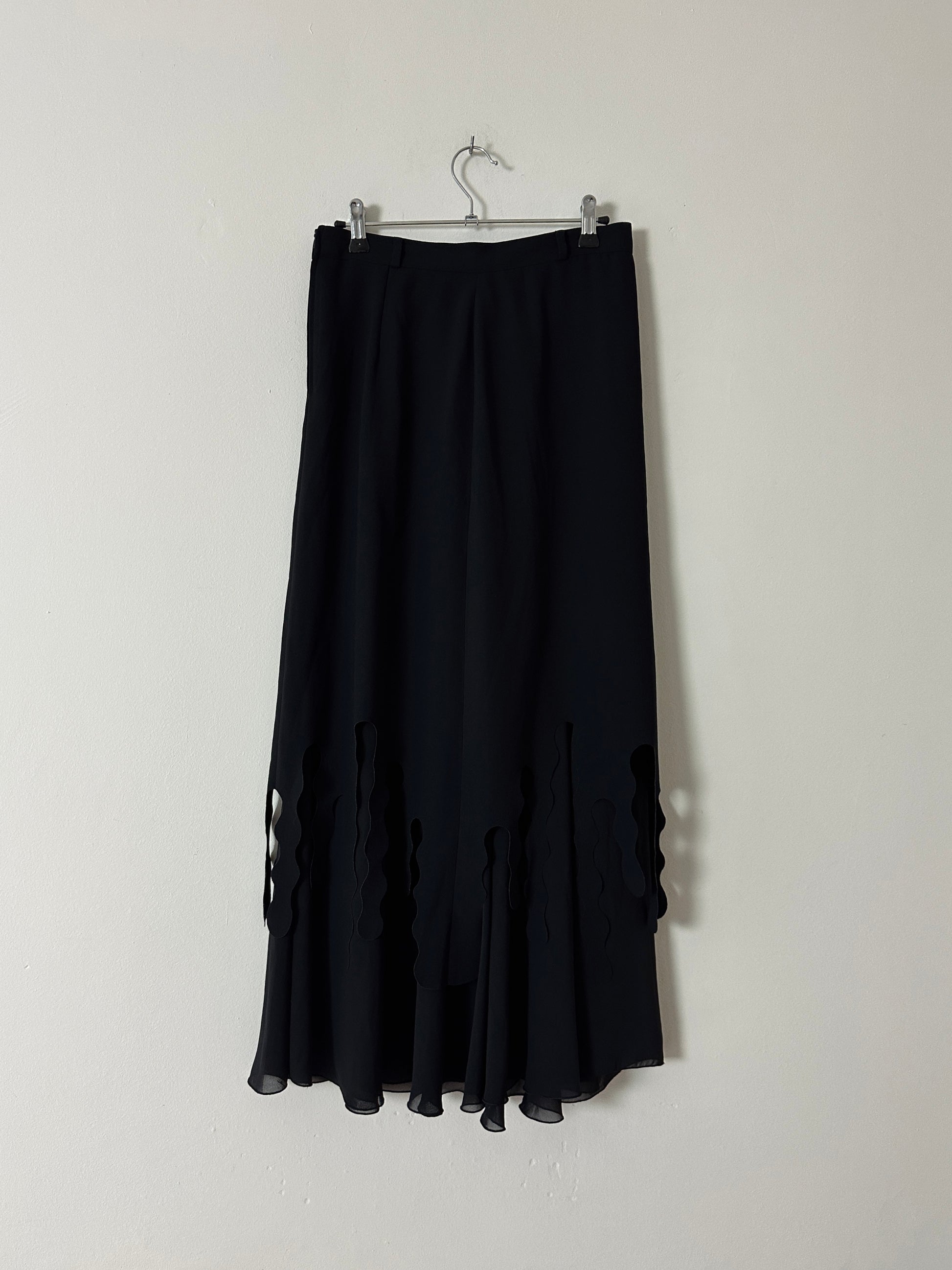 This sheer, mid-waist black skirt moves with fluid ease, featuring a double-layer construction and a detailed top layer. Finished with a discreet side zip.