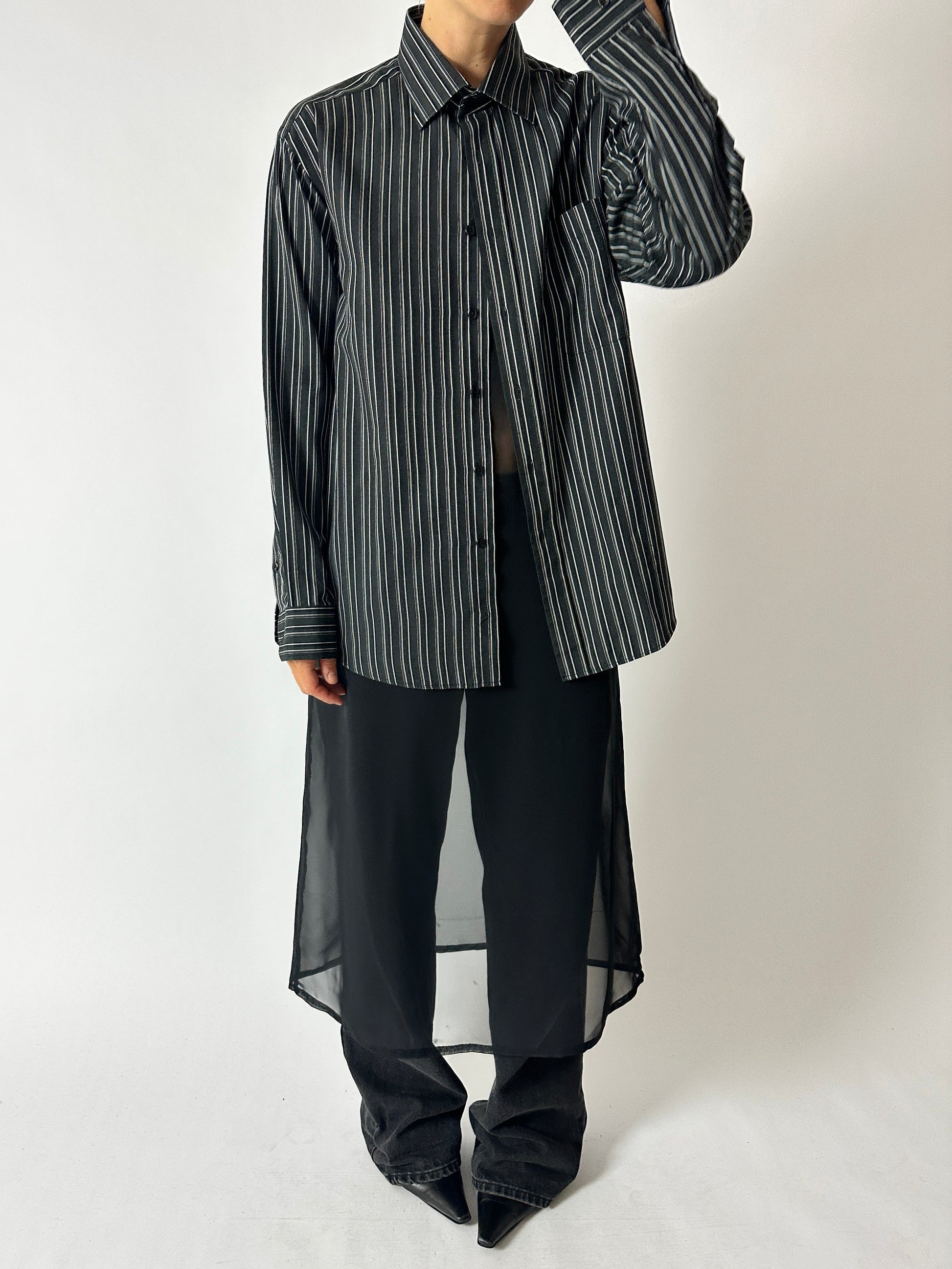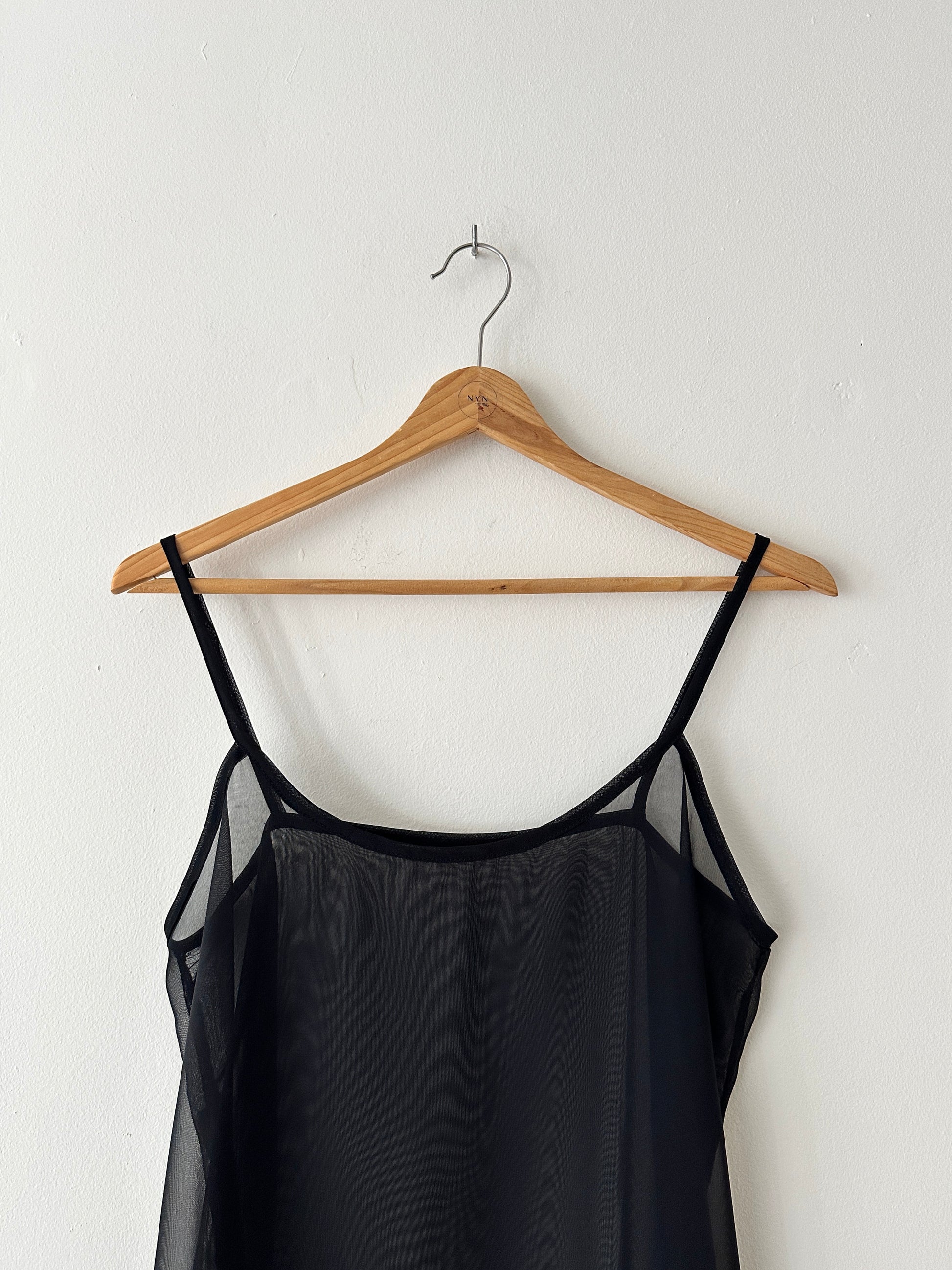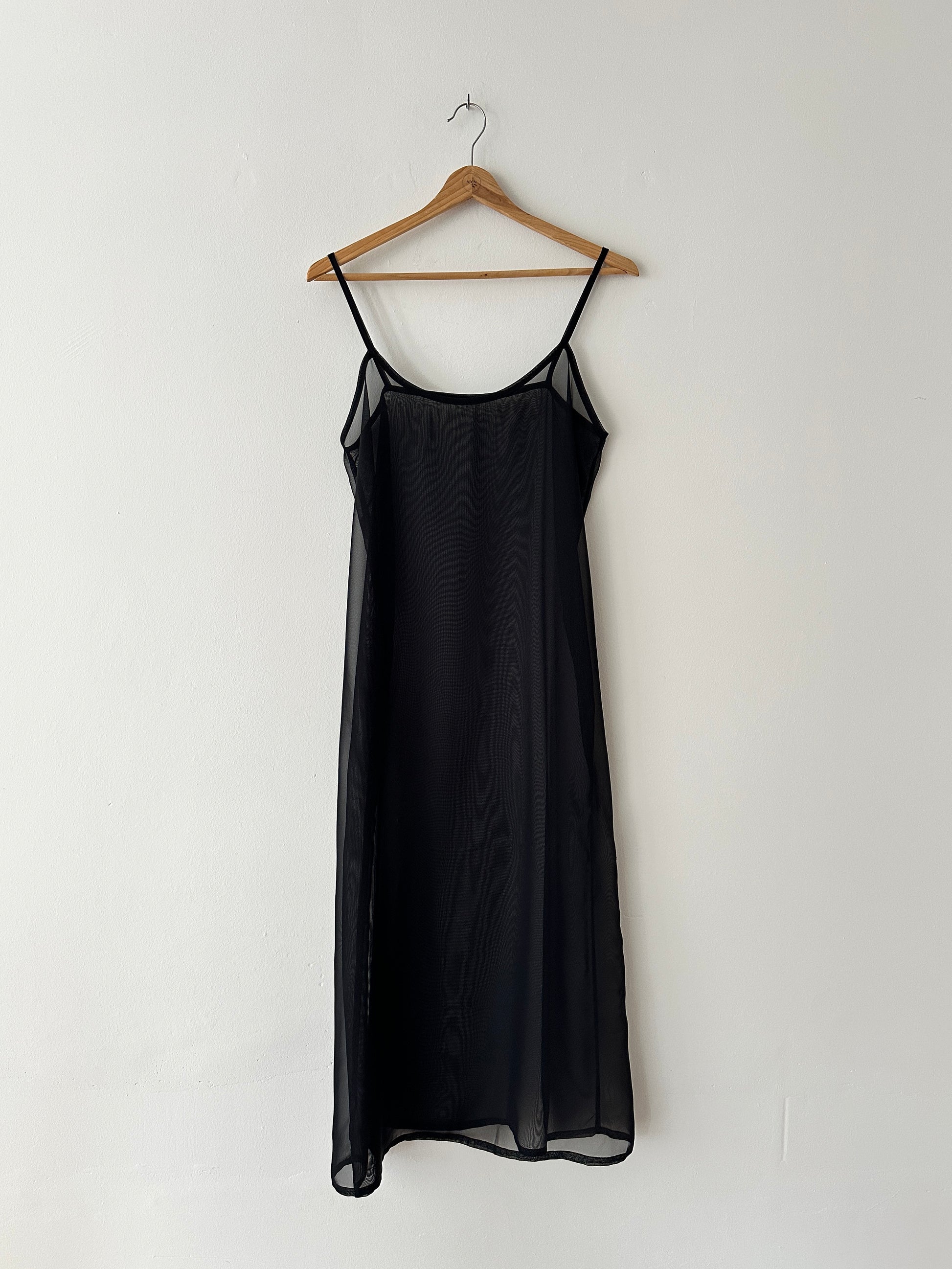 This sheer maxi dress features slim straps and a loose, airy silhouette, offering a minimalist yet effortlessly edgy layer for any outfit.