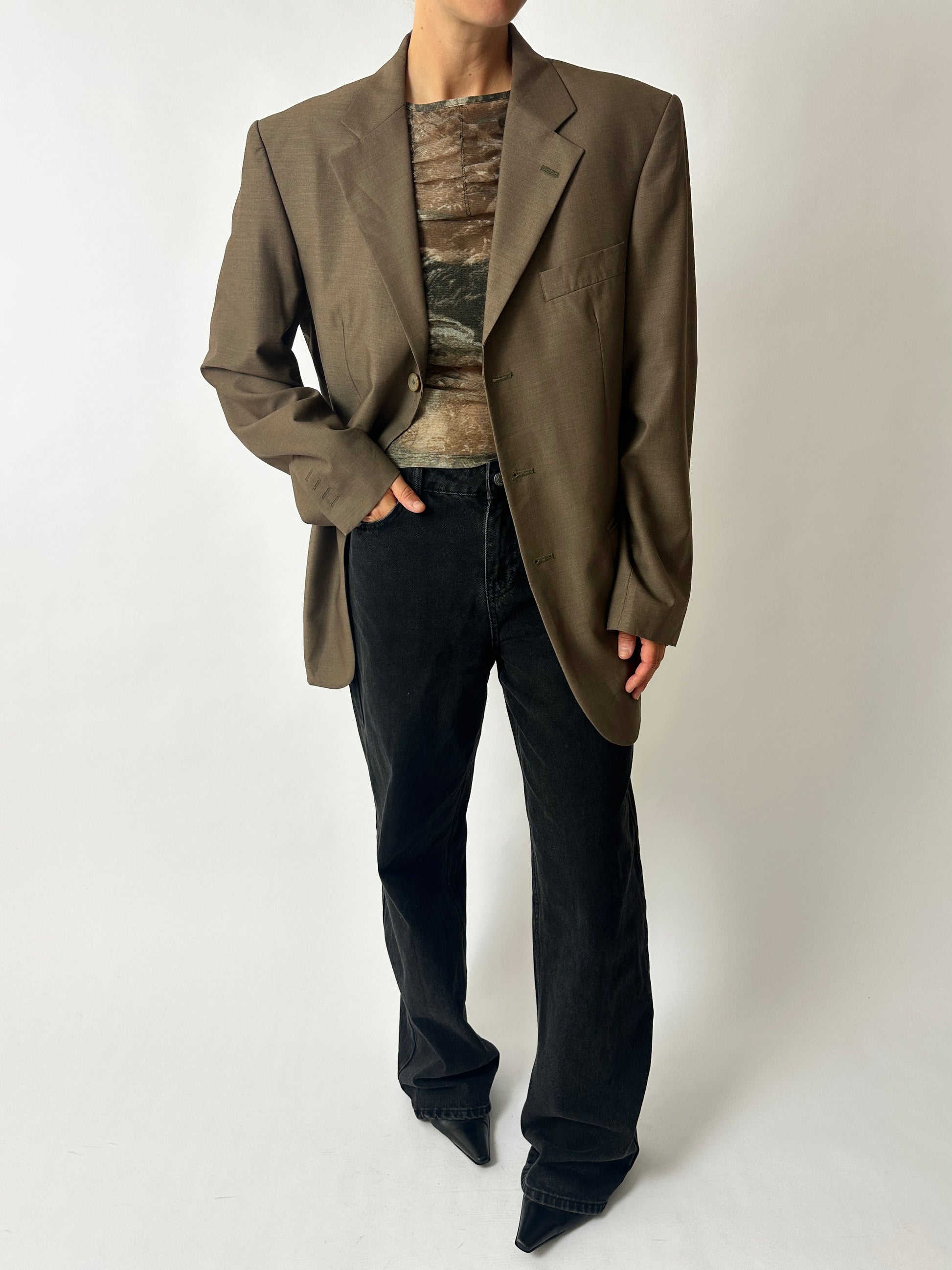 This sheer top features an all-over print and 3/4 sleeves, with a fitted silhouette. Its soft taupe beige tone adds a subtle, warm touch.
