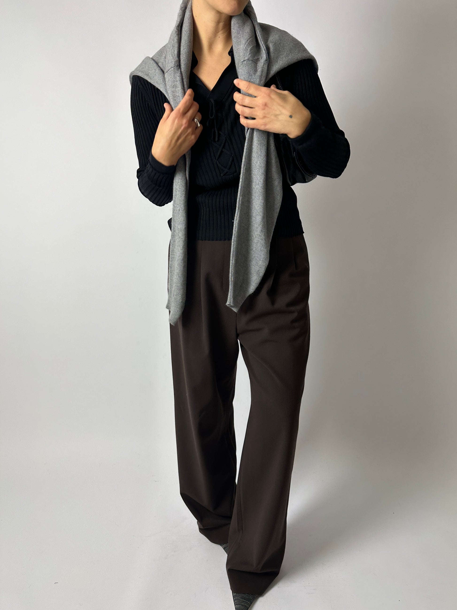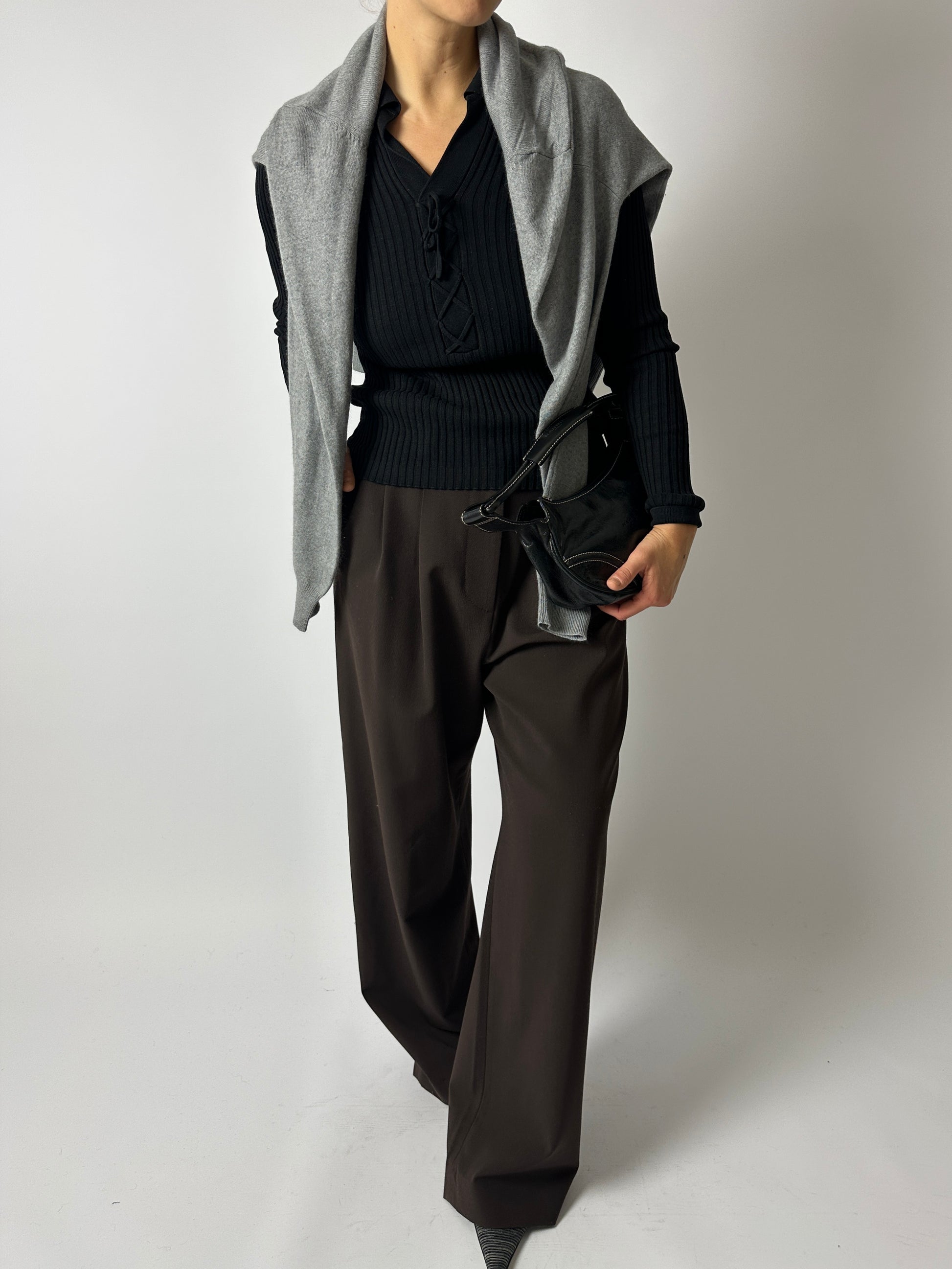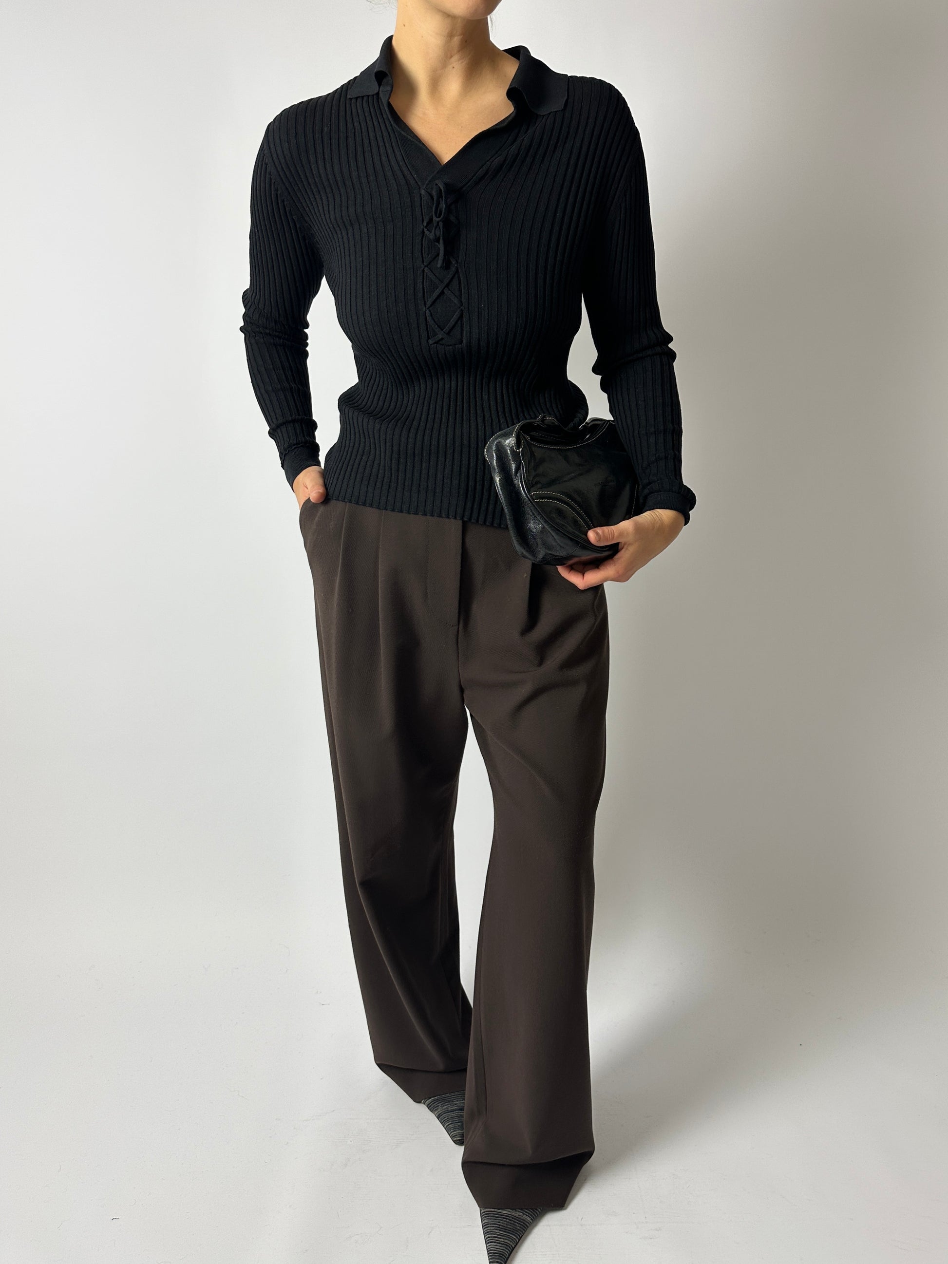 A fitted silk rib top featuring a lace-up front detail and collar. A refined, feminine piece with a subtle edge.