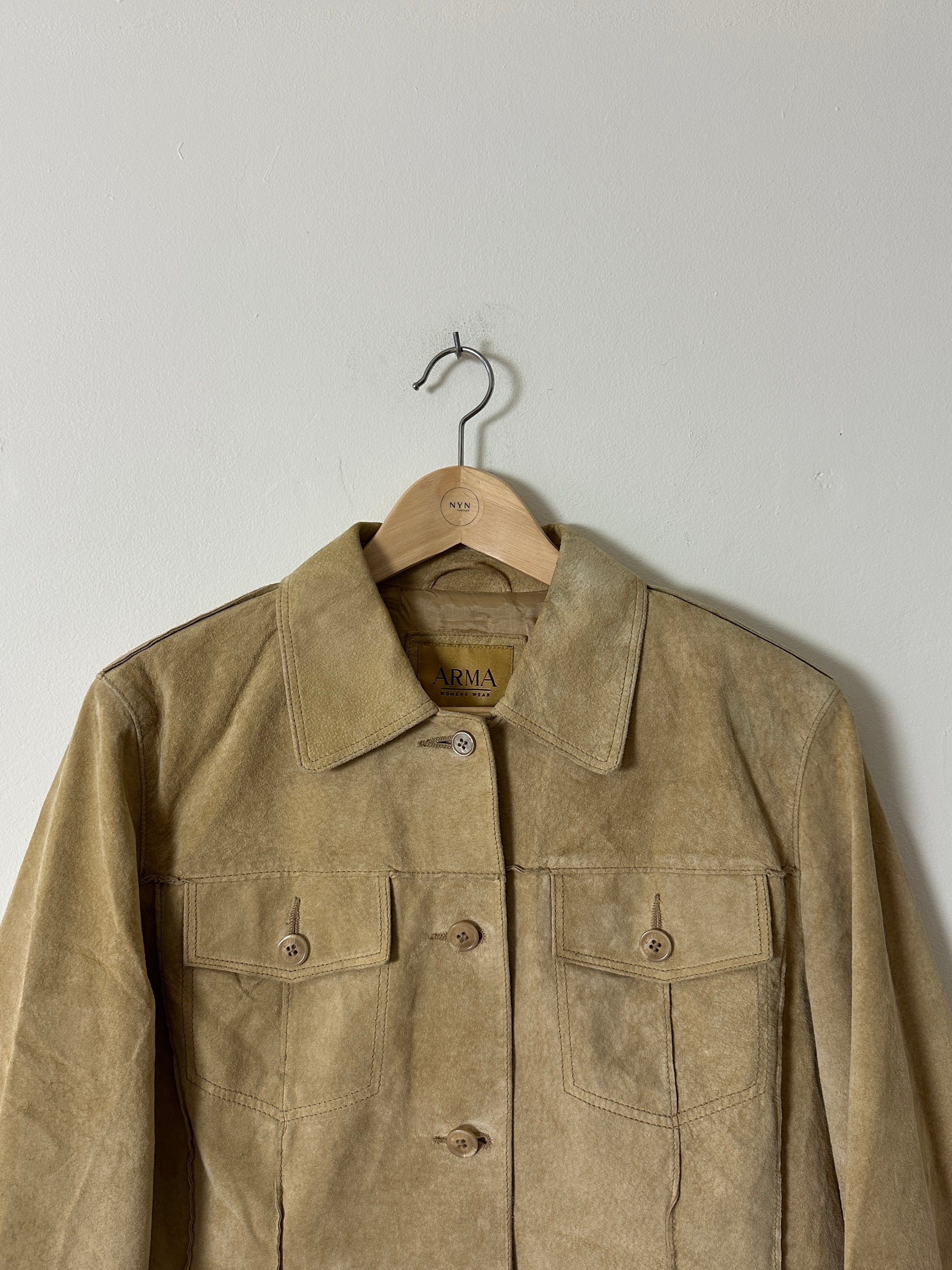 A relaxed, soft butter beige suede jacket with chest pockets and full lining. A timeless, understated piece with quiet elegance and effortless versatility.