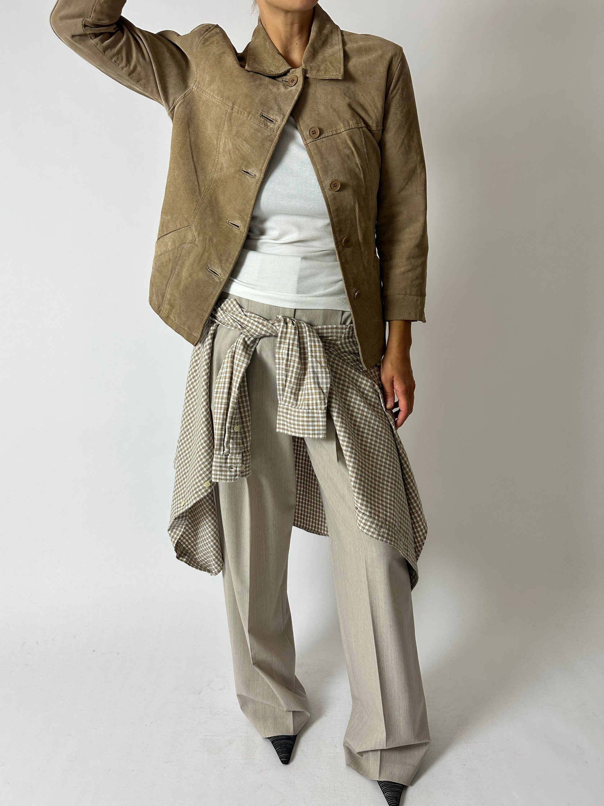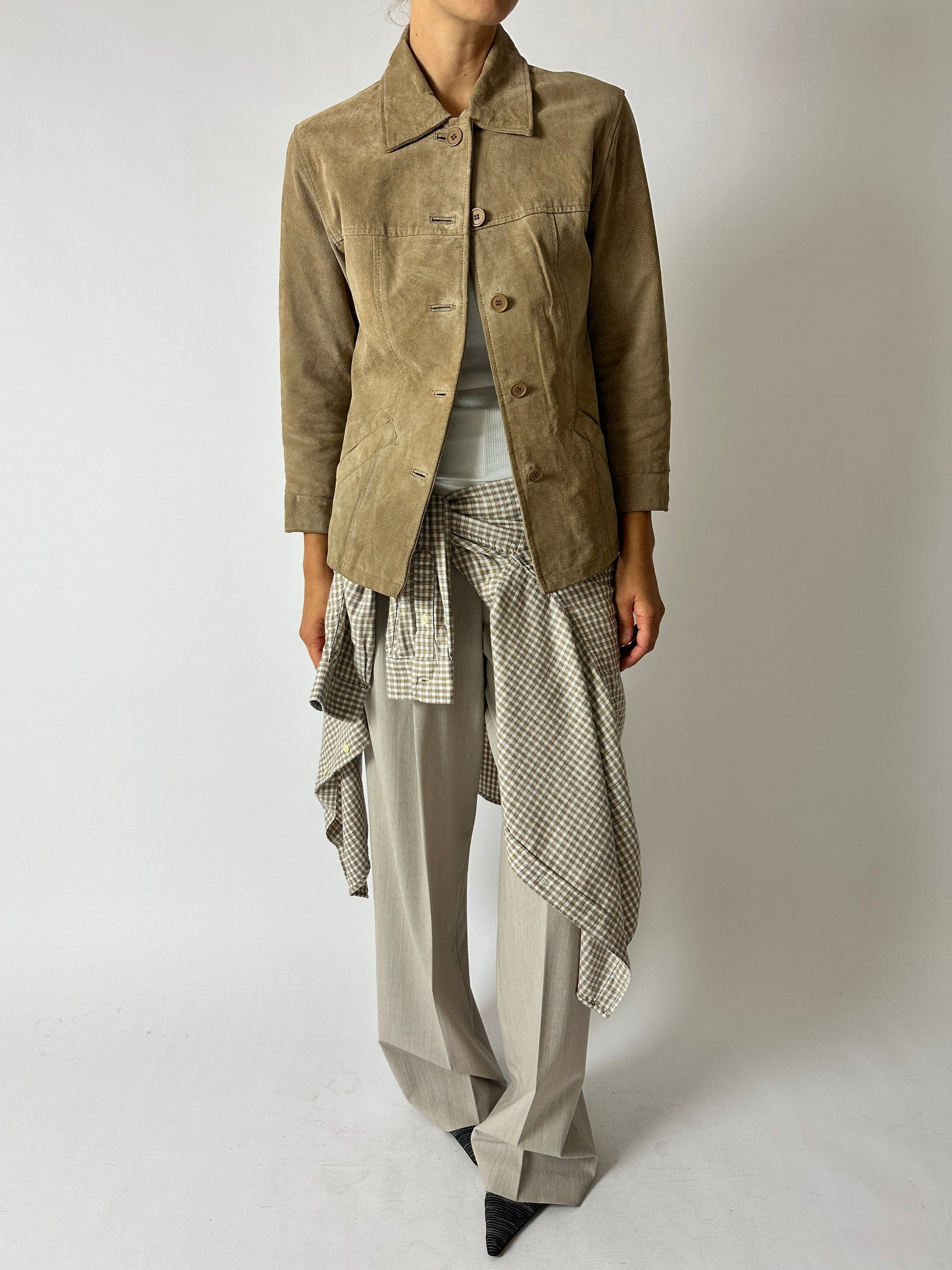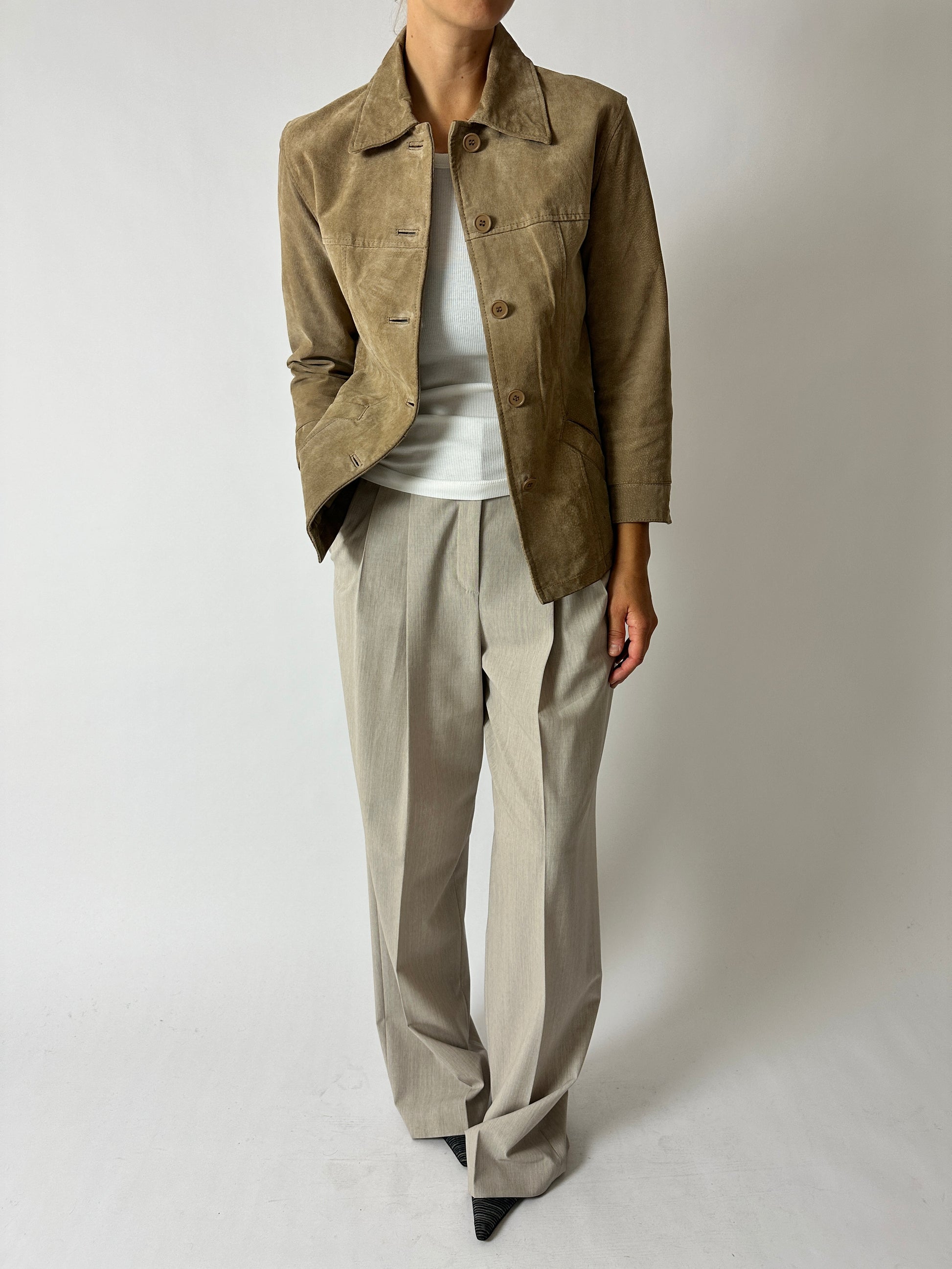 Relaxed suede jacket in a soft sand hue, fully lined and accented with side pockets.