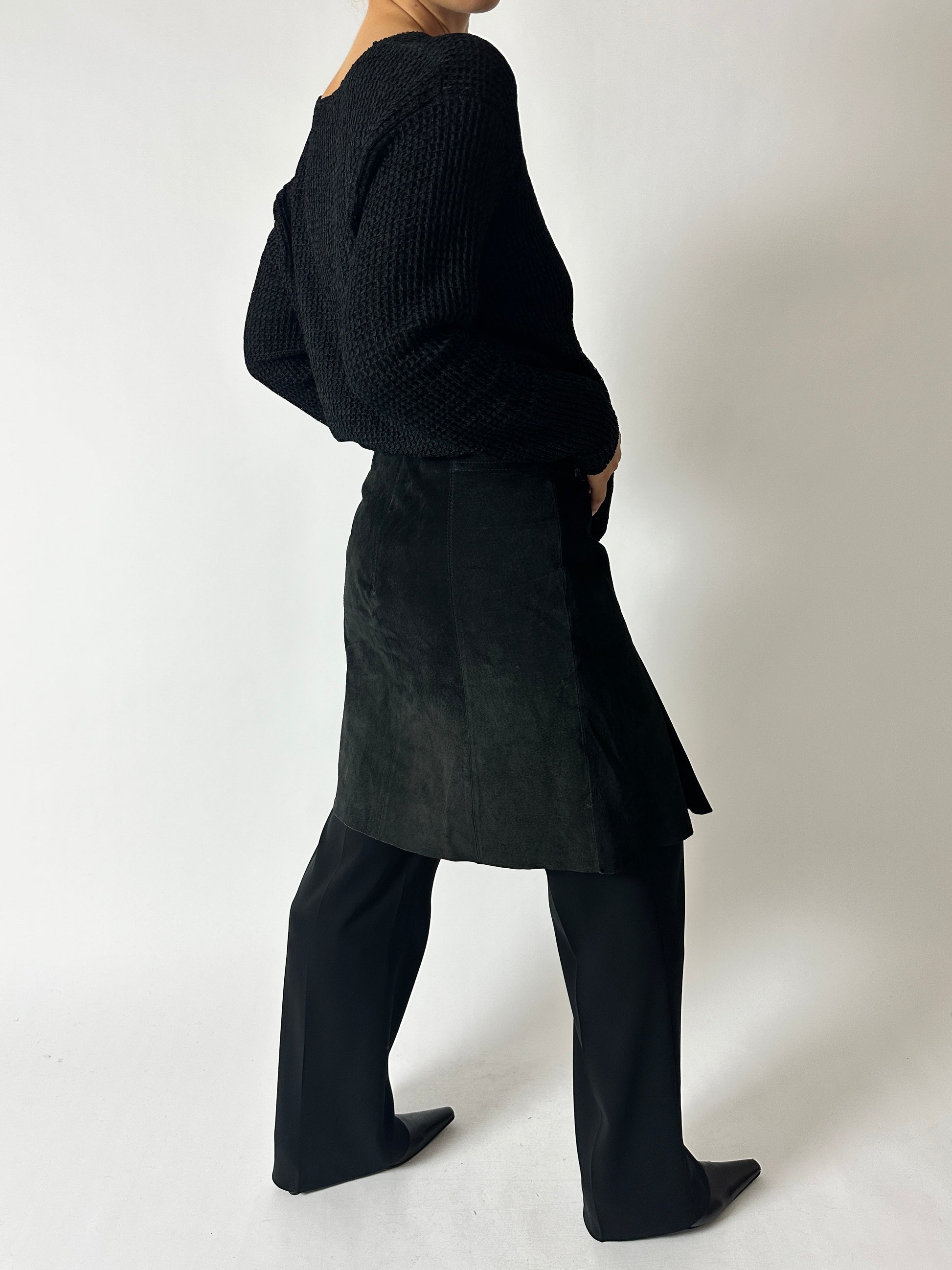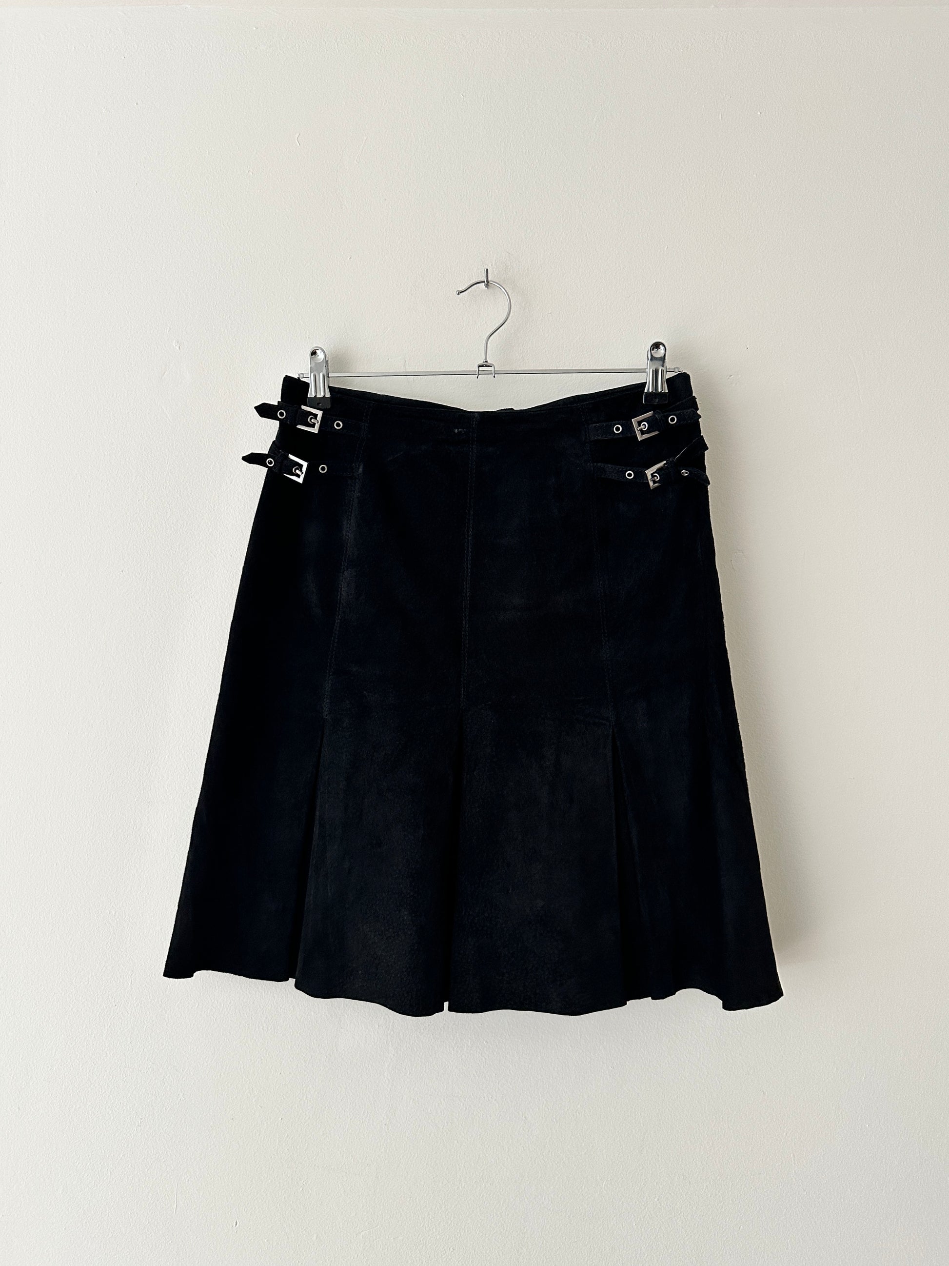 Pleated black skirt crafted from quality suede, fully lined for comfort and structure. Detailed with side buckle accents and finished with a back zip closure, it brings a timeless yet distinctive edge to any wardrobe.