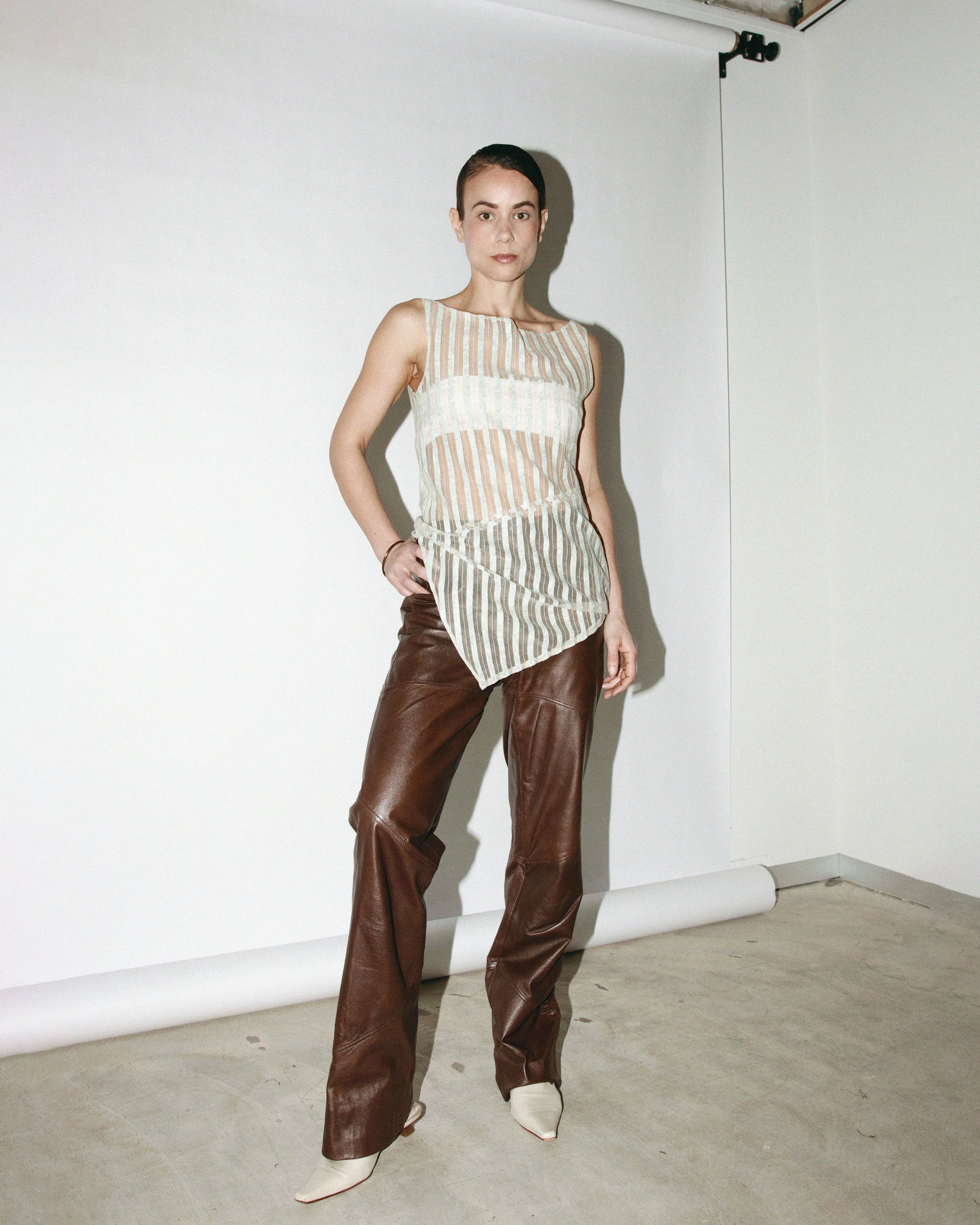 This limited edition piece is made with an exclusive curated dead-stock fabric, featuring a semi sheer striped look. This design was made to make a statement. Asymmetrical lines draw the eye, while a wide, open neckline adds a refined sense of elegance.