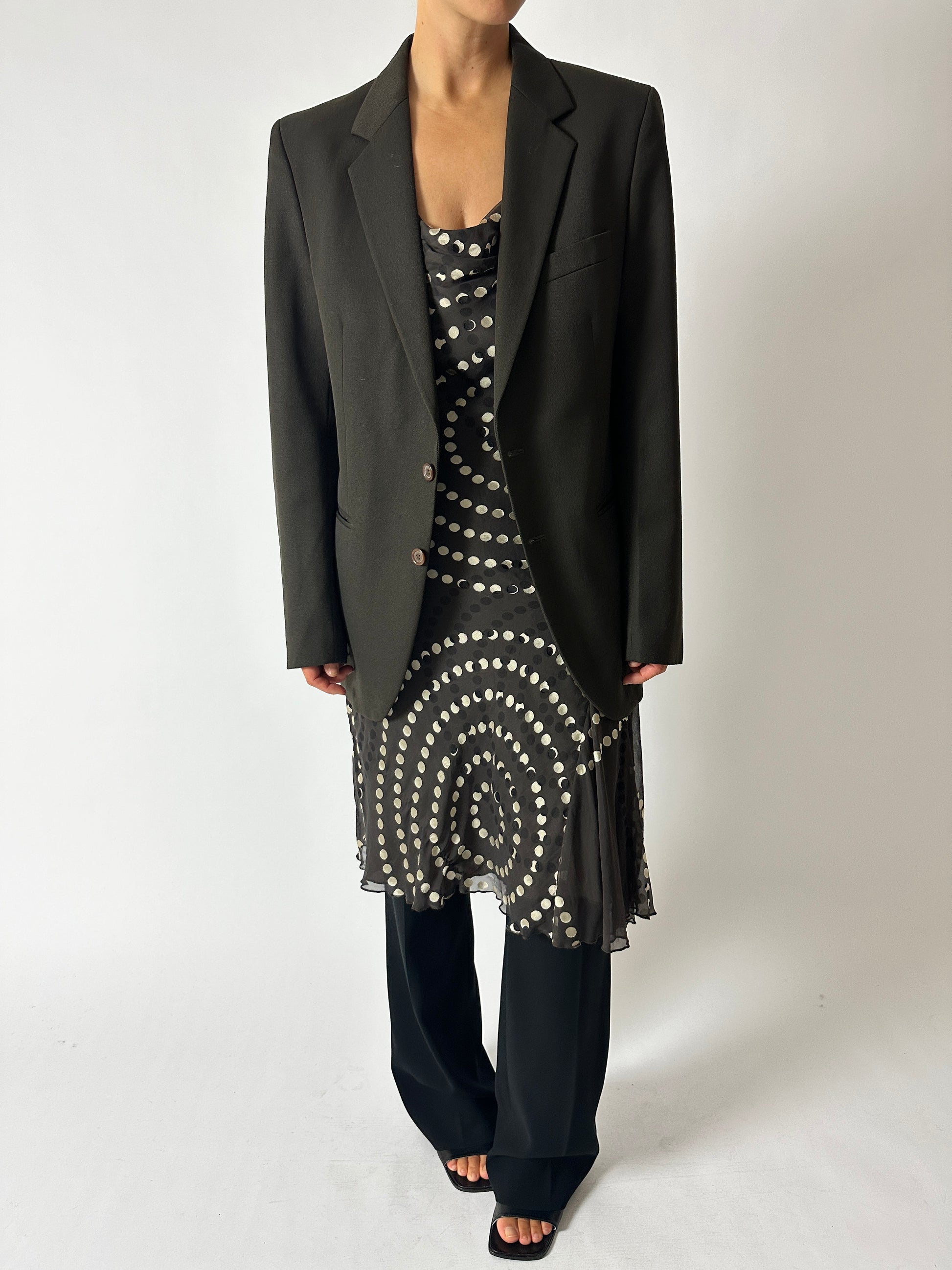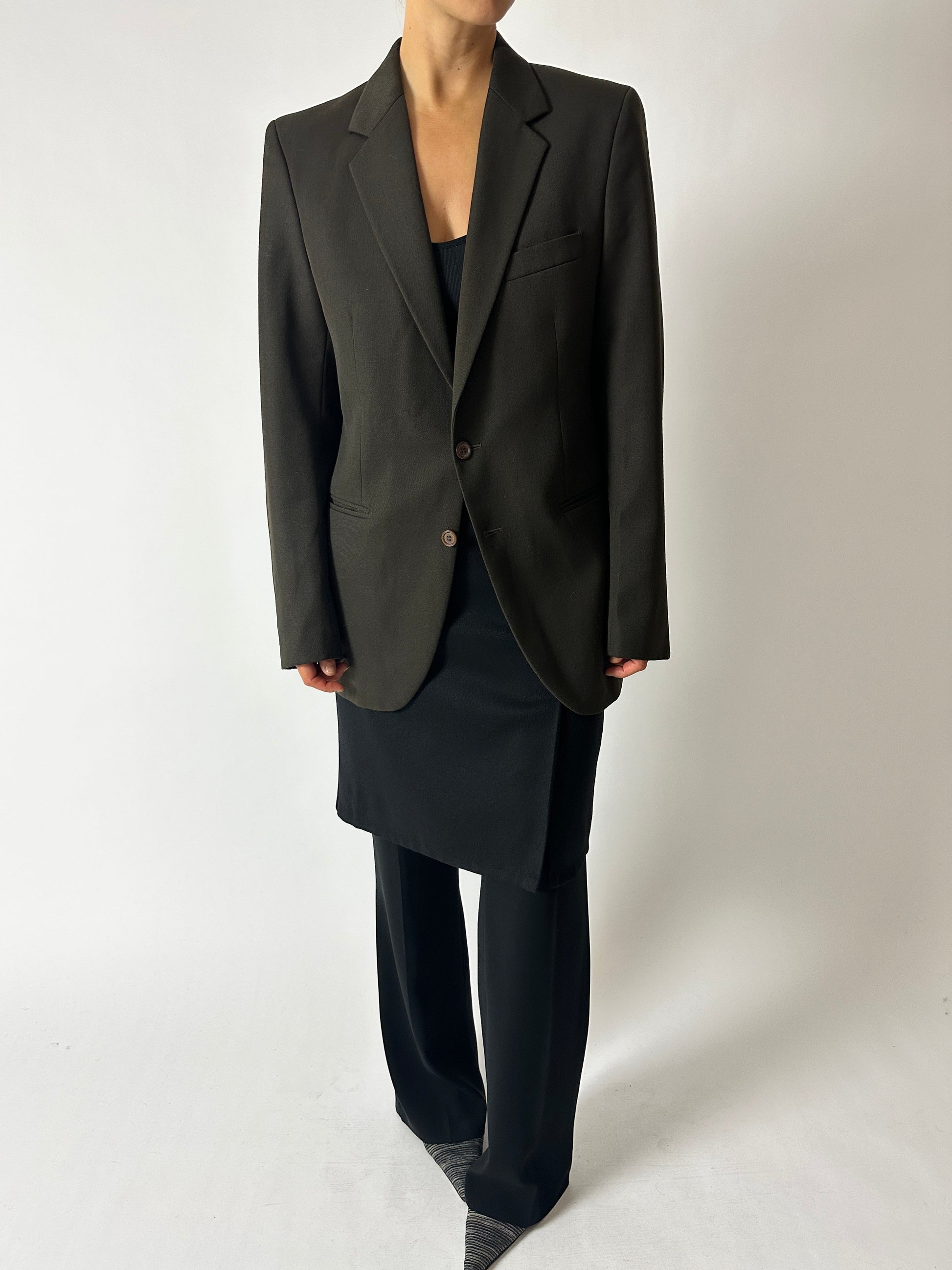This vintage blazer features an oversized silhouette, tailored from quality wool in a coffee brown tone. A timeless staple designed for effortless, year-round wear.