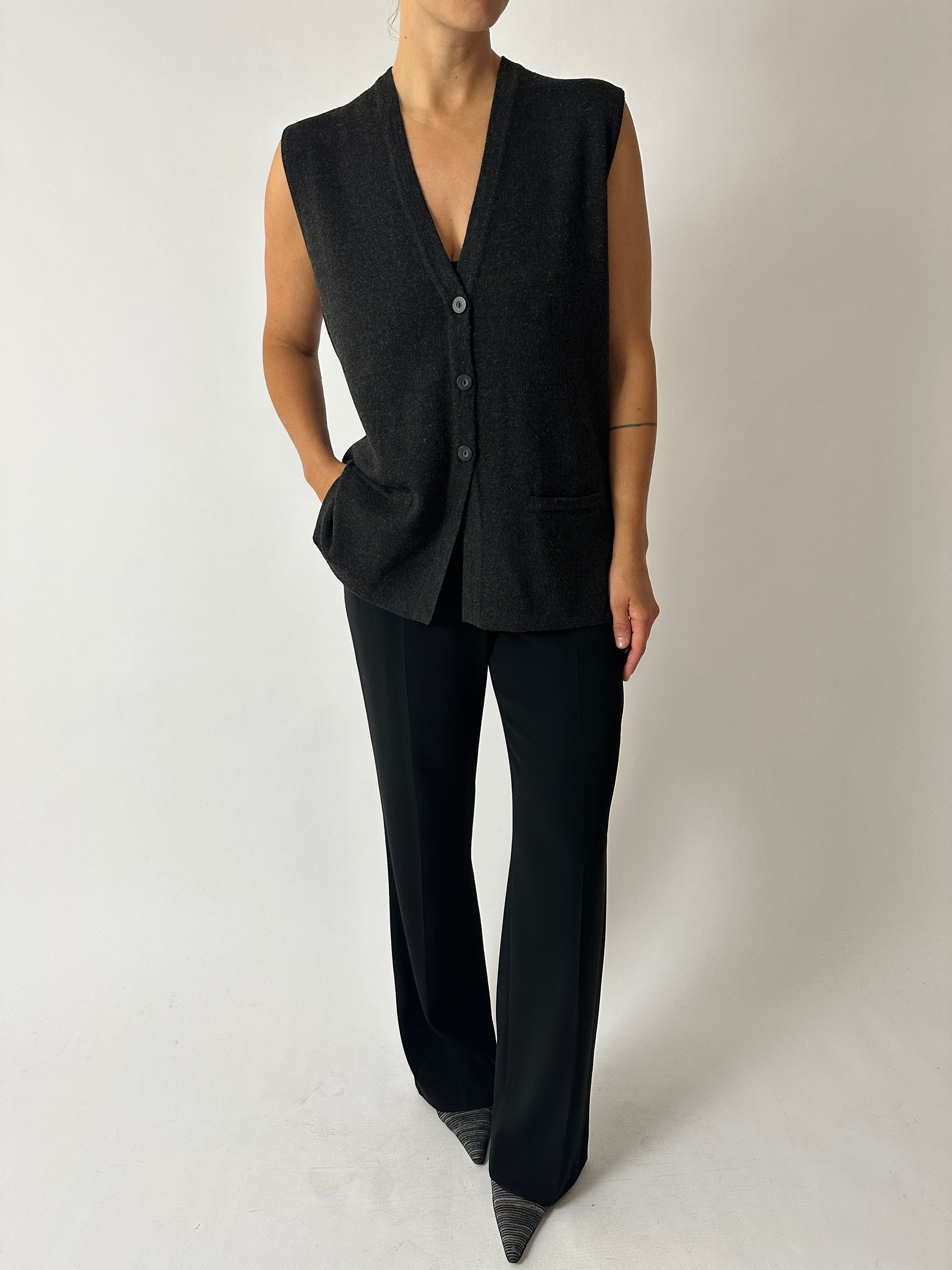 Dark grey sleeveless cardigan in a soft merino wool blend, with a relaxed fit for effortless layering and timeless style.