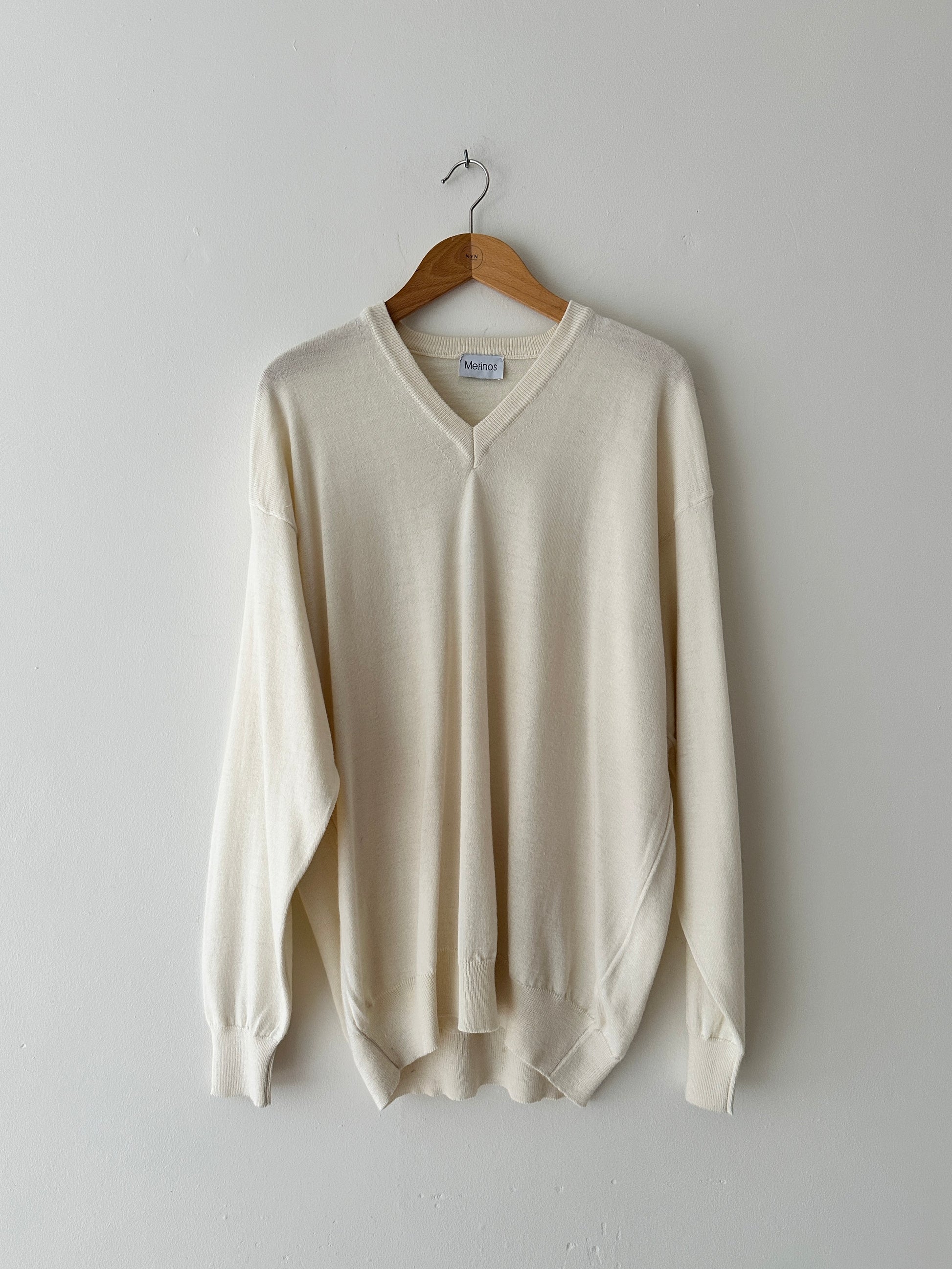 A soft essential in a off white-hued wool blend. This fine-knit sweater features a relaxed fit and a clean V-neckline. Lightweight, cozy, and effortlessly refined.