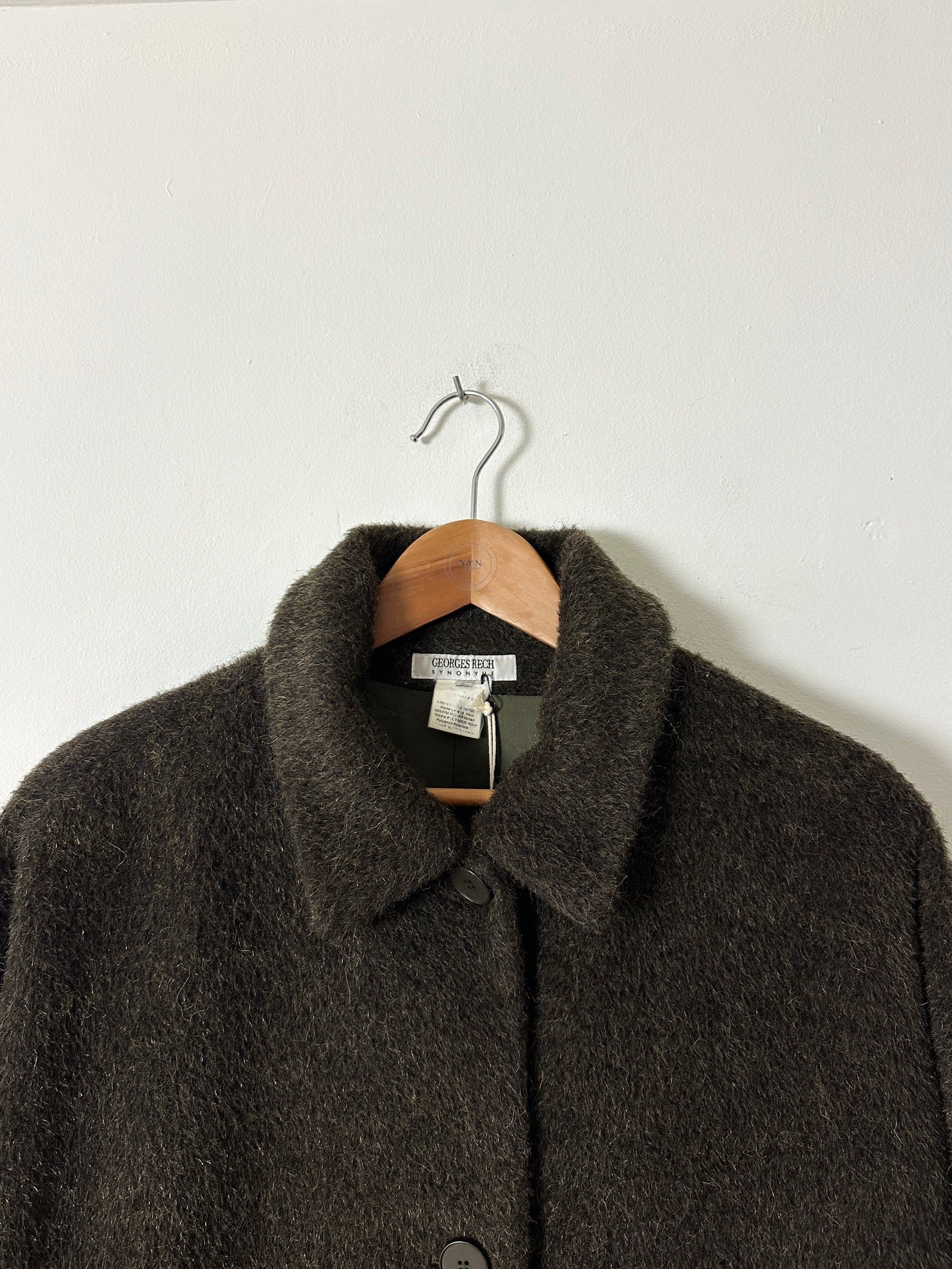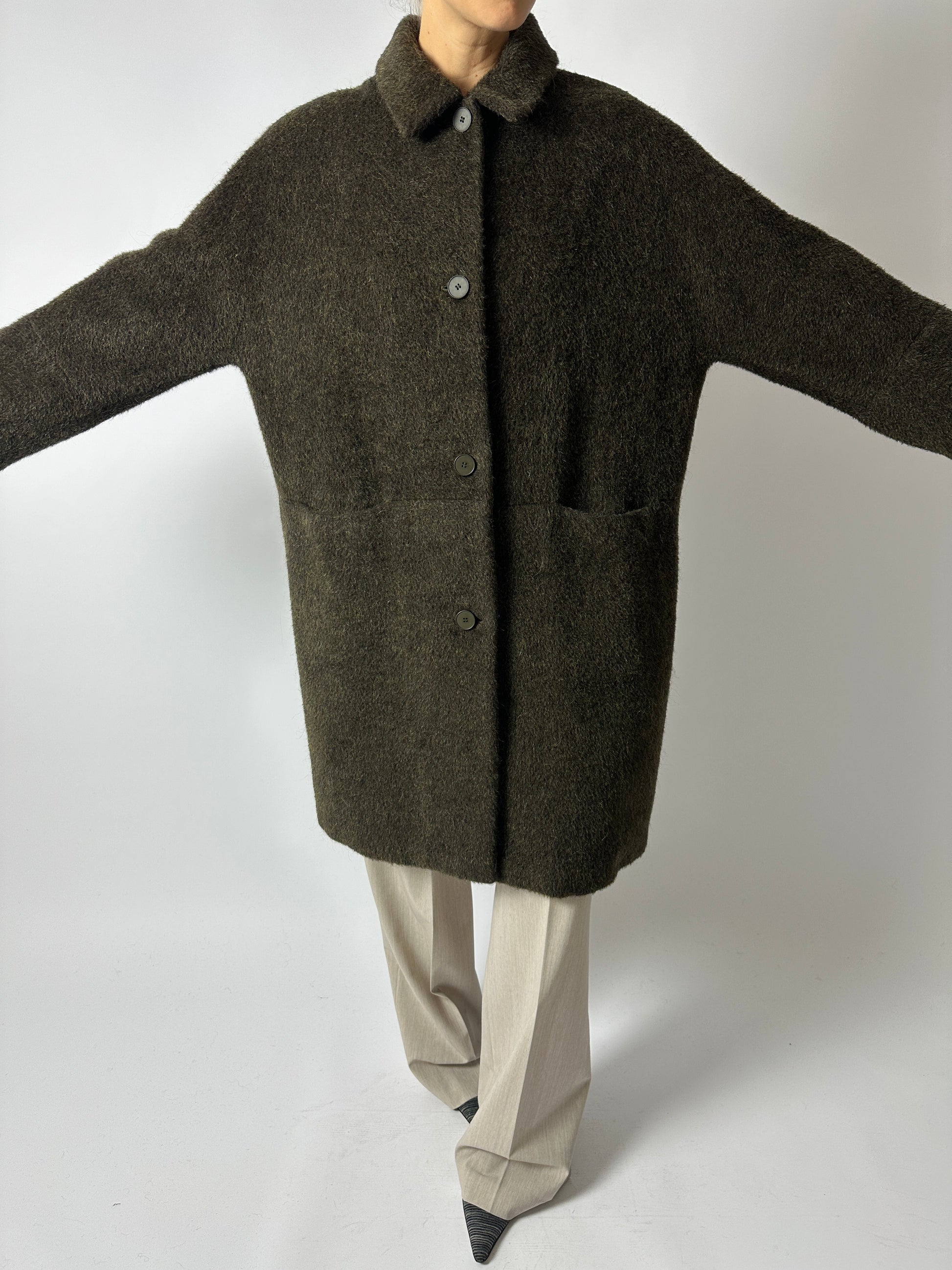 Crafted from a luxurious wool–mohair blend, this long coat comes in a rich mélange green hue with an exceptionally soft hand. Fully lined and finished with front pockets — an elegant balance of texture, warmth, and ease.